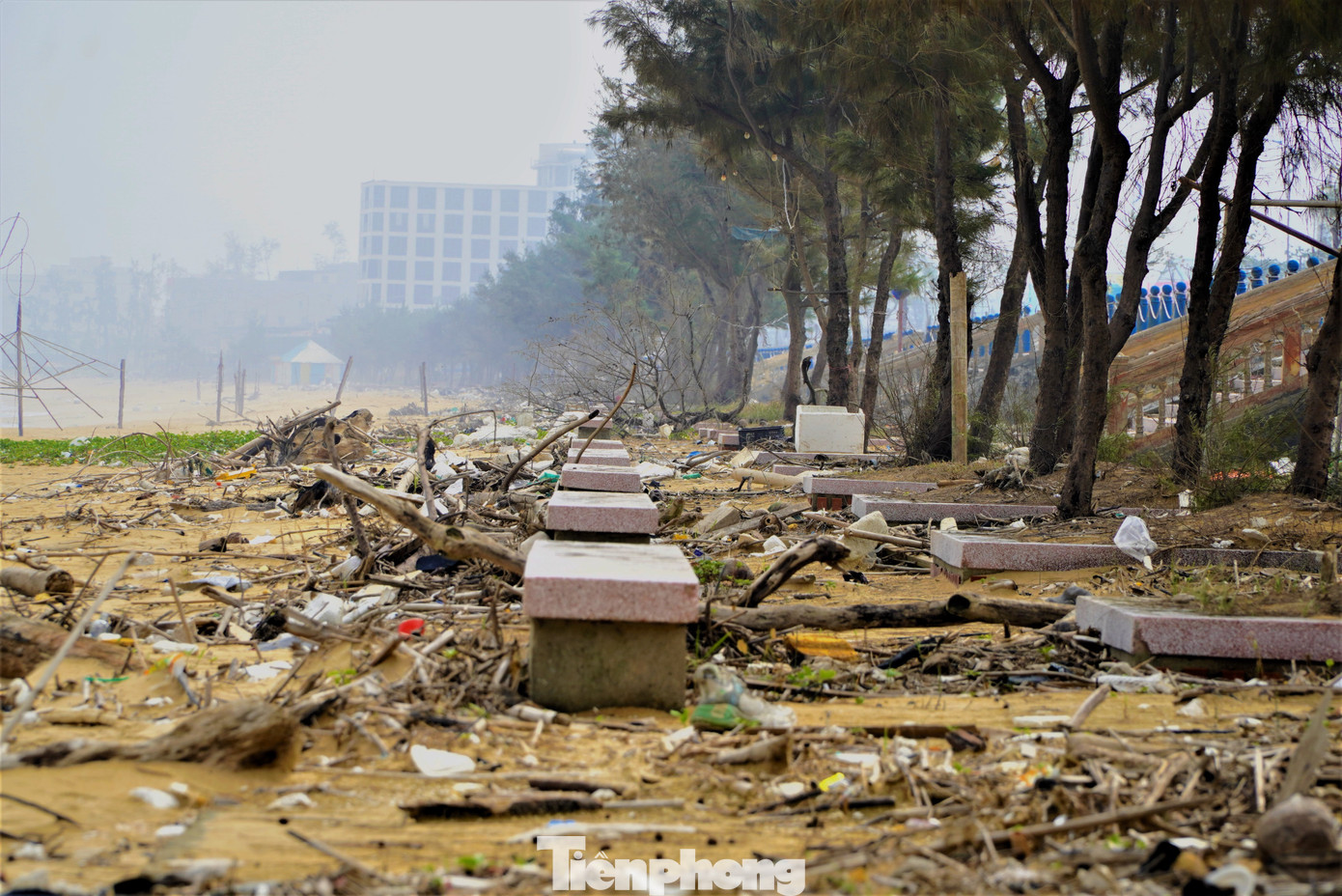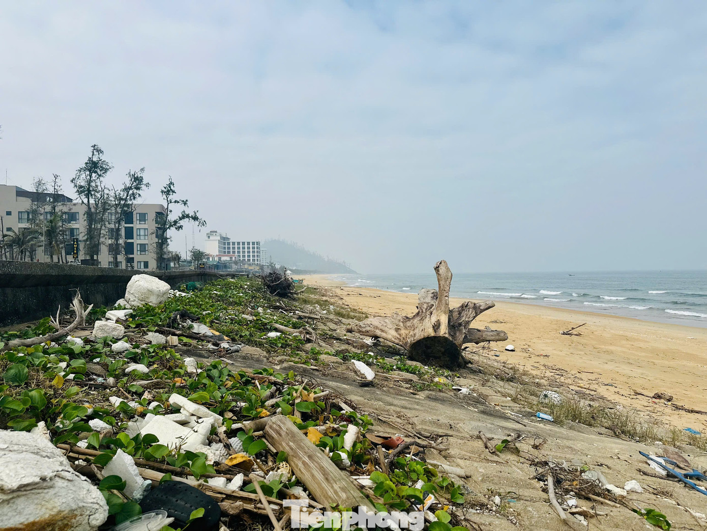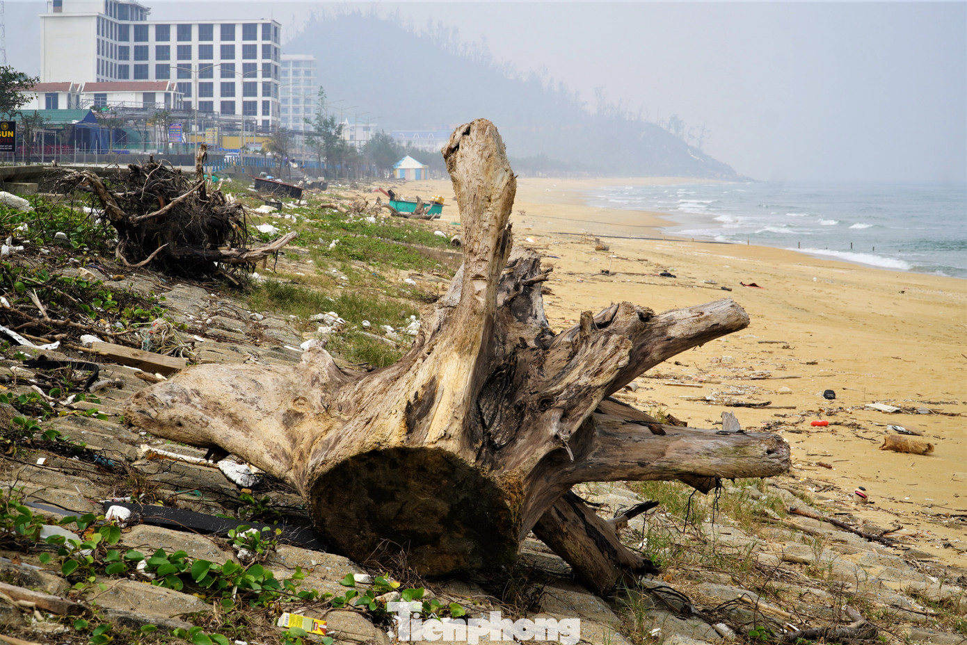 Những rễ cây, khối gỗ, rác thải dạt vào bờ biển, để lại khung cảnh nhếch nhác tại khu du lịch biển Thiên Cầm.