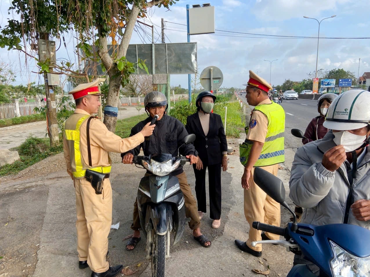 Cảnh sát giao thông Công an thành phố Đà Nẵng kiểm tra người điều khiển xe máy liệu có sử dụng rượu bia. Ảnh: CÔNG TÚ