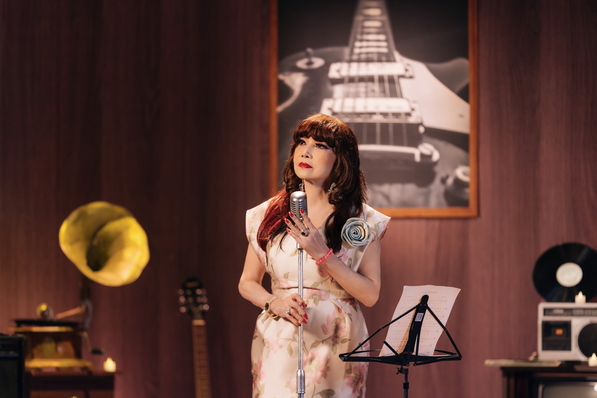 Danh ca Bảo Yến trong khung cảnh phòng thu nhạc đậm chất cổ điển.