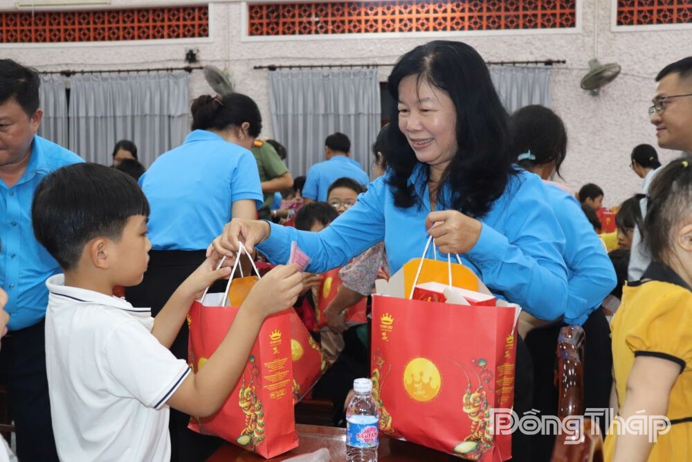 Đồng chí Huỳnh Thị Tuyết Vui, Chủ tịch Liên đoàn Lao động tỉnh Đồng Tháp tặng quà cho con của đoàn viên, người lao động dịp Tết Trung thu.