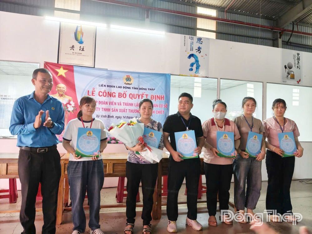 Đồng chí Hoàng Khắc Tinh, Phó Chủ tịch Thường trực Liên đoàn Lao động tỉnh Đồng Tháp trao Quyết định thành lập Công đoàn cơ sở Công ty TNHH Sản xuất Thương mại SX Vĩnh Chiết (xã Vĩnh Bình).