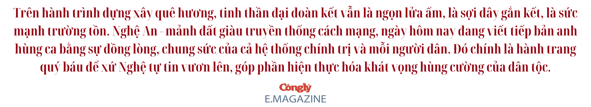 Trên hành trình dựng xây quê hương, tinh thần đại đoàn kết vẫn là ngọn lửa ấm, là sợi dây gắn kết, là sức mạnh trường tồn. Nghệ An - mảnh đất giàu truyền thống cách mạng, ngày hôm nay đang viết tiếp bản anh hùng ca bằng sự đồng lòng, chung sức của cả hệ thống chính trị và mỗi người dân. Đó chính là hành trang quý báu để xứ Nghệ tự tin vươn lên, góp phần hiện thực hóa khát vọng hùng cường của dân tộc.