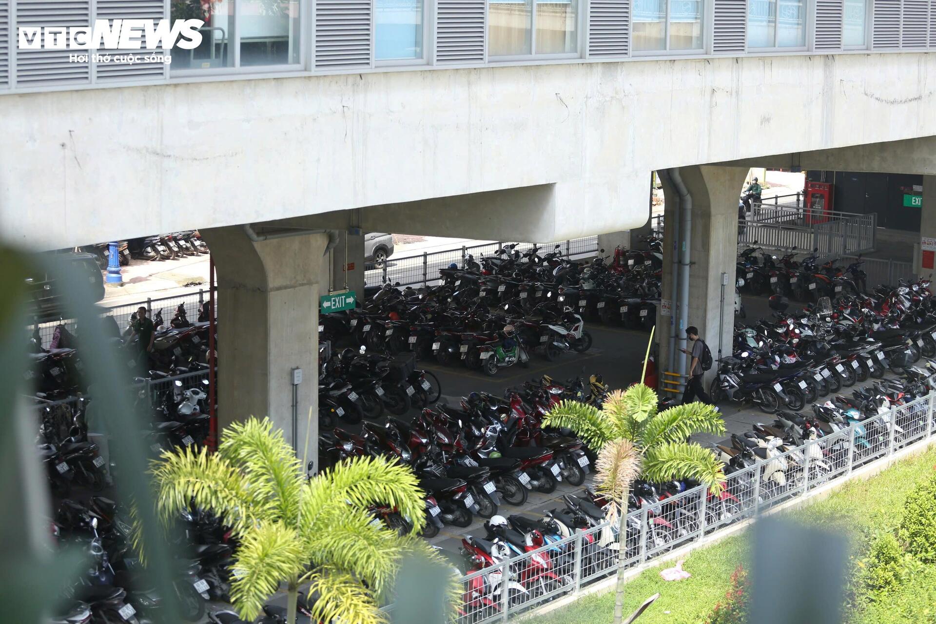 Tại ga Bến Thành - điểm đầu của tuyến Metro số 1, hàng dài xe máy xếp hàng chờ vào bãi ngay từ sớm. Nhân viên trông giữ liên tục di chuyển, sắp xếp lại từng hàng xe để tận dụng tối đa diện tích. Dù vậy, chỉ đến khoảng 7h30, bãi đã chật kín.