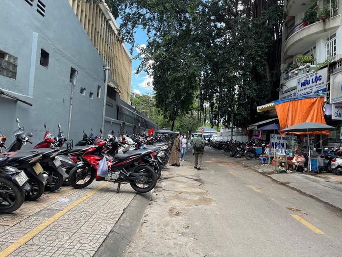 Theo ghi nhận của phóng viên, chiều 7-10, trên vỉa hè đường Đặng Thái Thân - đoạn cạnh Bệnh viện Đại học Y dược TP HCM, hàng trăm xe máy dựng san sát 2-3 hàng. Vỉa hè ở đây đã trở thành những bãi giữ xe tự phát.