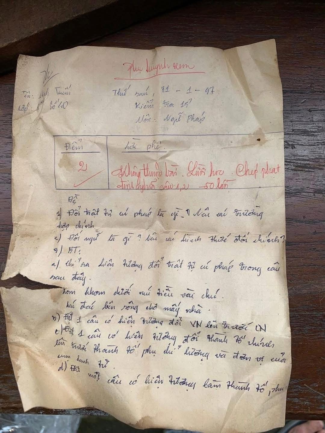 Đây là bài kiểm tra 15 phút môn Ngữ pháp dành cho học sinh lớp 8. Nét chữ nghiêng, được viết bằng mực xanh của "cựu học sinh" Minh Tuấn vẫn còn rõ nét. Góc trên cùng của bài làm ghi rõ lời phê của giáo viên bằng mực đỏ: “Không thuộc bài. Lười học. Chép phạt định nghĩa câu 1, 2 - 50 lần”.