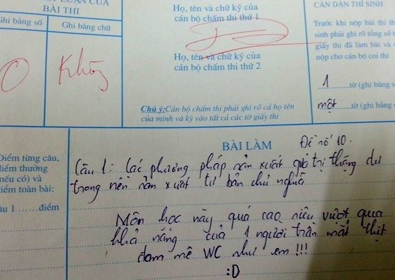 Em học sinh lại tỏ ra cợt nhả, viết nội dung như sau ở phần bài làm: "Môn học này quá cao siêu, vượt qua khả năng của một người trần mắt thịt đam mê WC như em". Cuối bài, em học sinh còn thản nhiên vẽ icon "mặt cười".