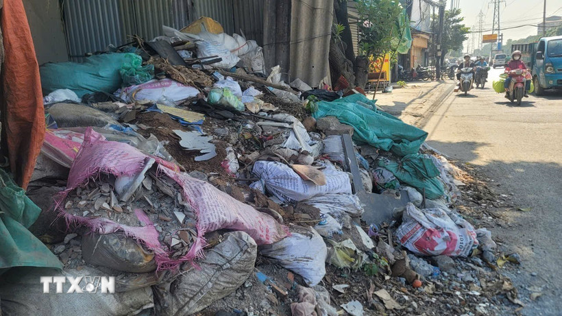 Bãi rác lộ thiên gây ô nhiễm môi trường và ảnh hưởng đến sức khỏe, cảnh quan đô thị Hà Nội. (Ảnh: Phương Anh/TTXVN)
