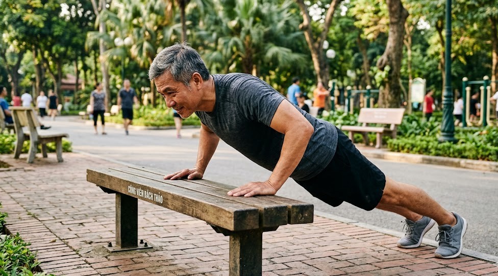 Chống đẩy trên mặt phẳng nghiêng là biến thể nhẹ hơn của chống đẩy truyền thống, phù hợp với người trung niên hoặc người đang trong giai đoạn phục hồi cơ bắp sau tập tạ. Bài tập này giúp tăng cường sức mạnh cho cơ ngực, cơ vai, cơ tam đầu cánh tay, đồng thời kích hoạt cơ lõi để giữ ổn định thân mình. Việc đặt tay trên bề mặt cao giúp giảm tải cho khớp vai và cổ tay, nhưng vẫn đảm bảo kích thích cơ bắp.