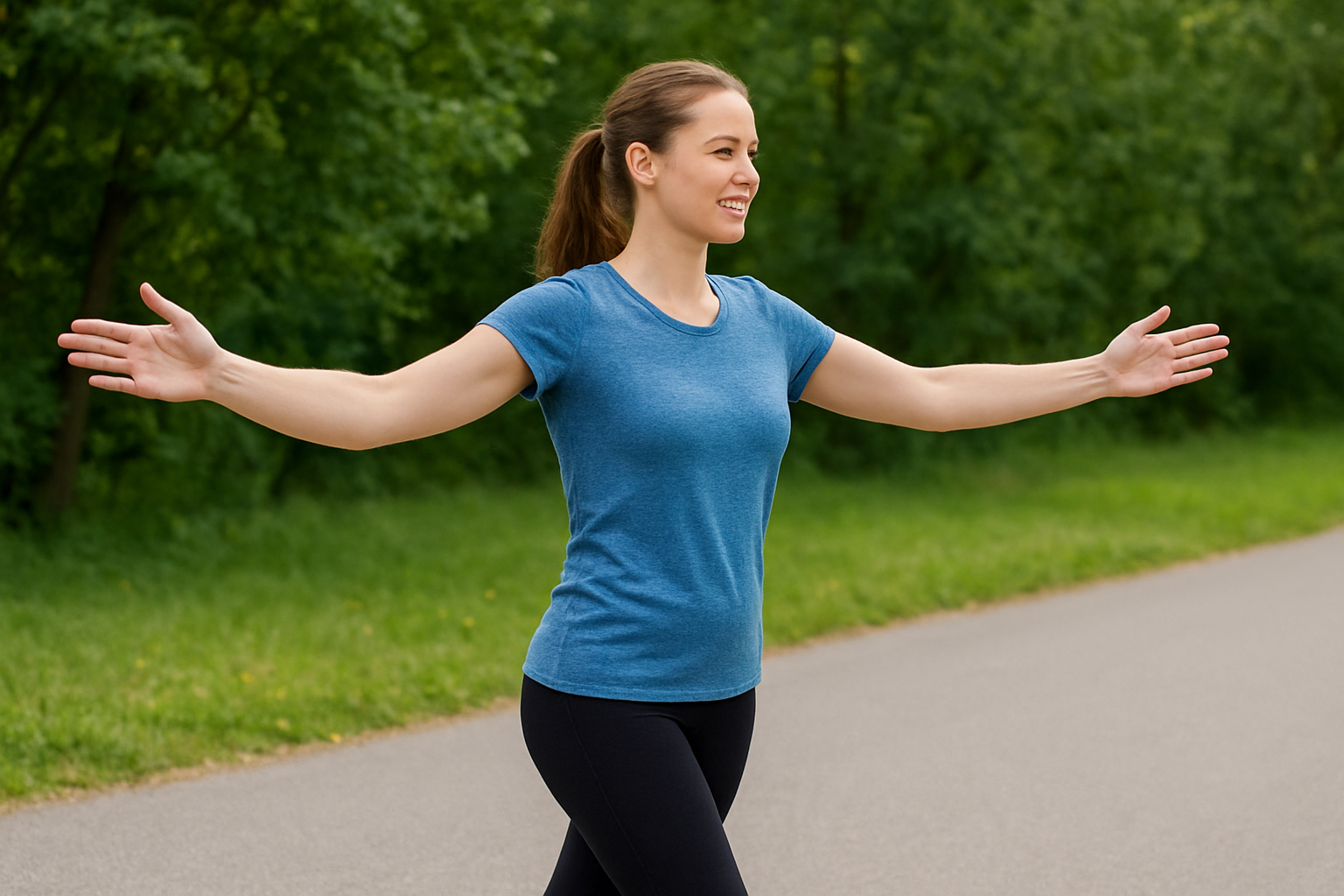 - Bắt đầu bằng dáng đi bộ tự nhiên, lưng thẳng, vai thả lỏng.