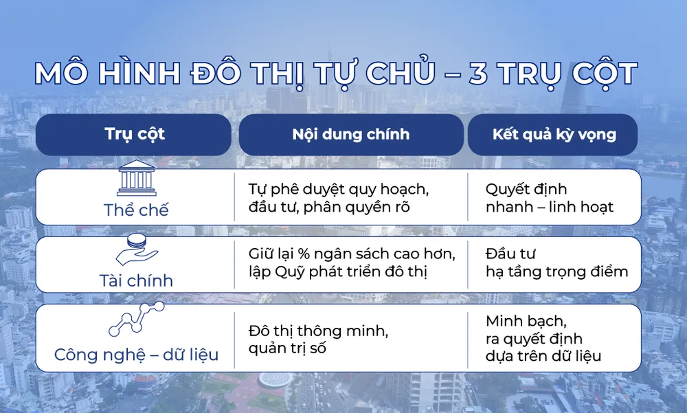 Ba trụ cột của mô hình đô thị tự chủ là thể chế, tài chính và công nghệ - dữ liệu. Đồ họa: KIÊN YÊN