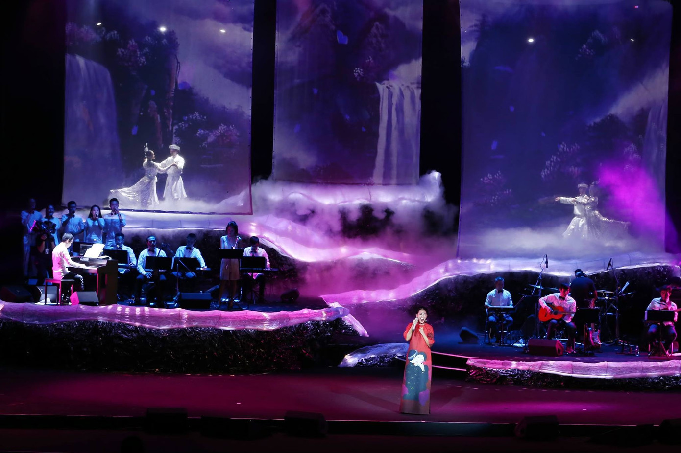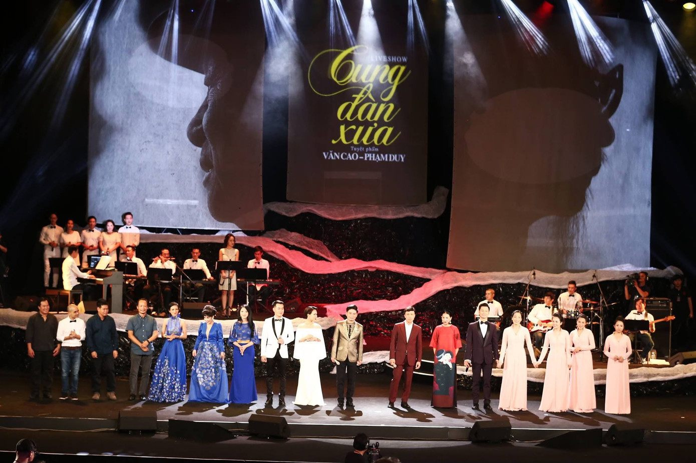 Trừ khi có tài trợ hoặc nhân dịp kỷ niệm lớn mới nên bố trí dàn nhạc phong cách giao hưởng hoành tráng đông người, còn thì nên gói ghém ở quy mô vừa phải, cân đối giữa hát và nhạc, thường là band điện tử thêm một số cây dàn dây. Sân khấu ham lớn quá sẽ trống trải nếu ít người trên đó, sẽ tốn kém hơn nữa nếu lấp không gian bằng cách thêm ra nhiều cách dàn dựng múa may, hợp xướng đông người và phối khí phức tạp, quy mô, chưa nói càng phối hoành tráng càng phải tập luyện nhiều hơn, mà đôi khi nhạc phẩm của các nhạc sĩ không phải bản nào cũng đòi hỏi sự cầu kỳ. Sân khấu quá lớn, nhất là ở những địa điểm như nhà thi đấu vừa loãng, vừa khó nghe, vừa kém sang cho chương trình dạng này. Sân khấu sang trọng thì thường đẹp ngay từ khu sảnh chờ đến chỗ ngồi.