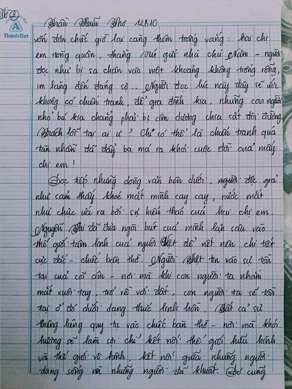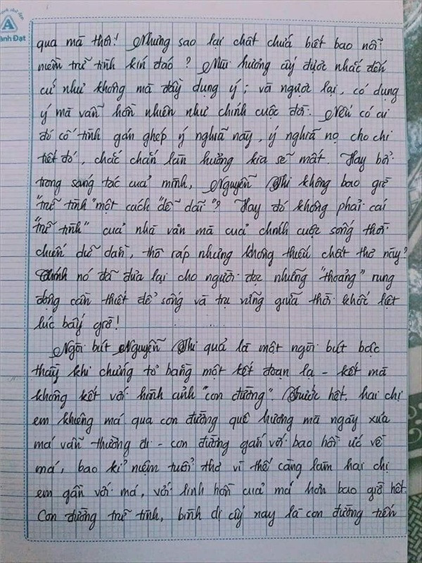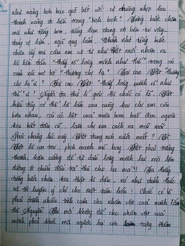 Nguyên văn lời phê của giáo viên như sau: "Quả thật, cô không biết phải phê gì - khi mọi ngôn từ đều trở nên bất lực. Dành tặng em hai chữ: Đáng khen".