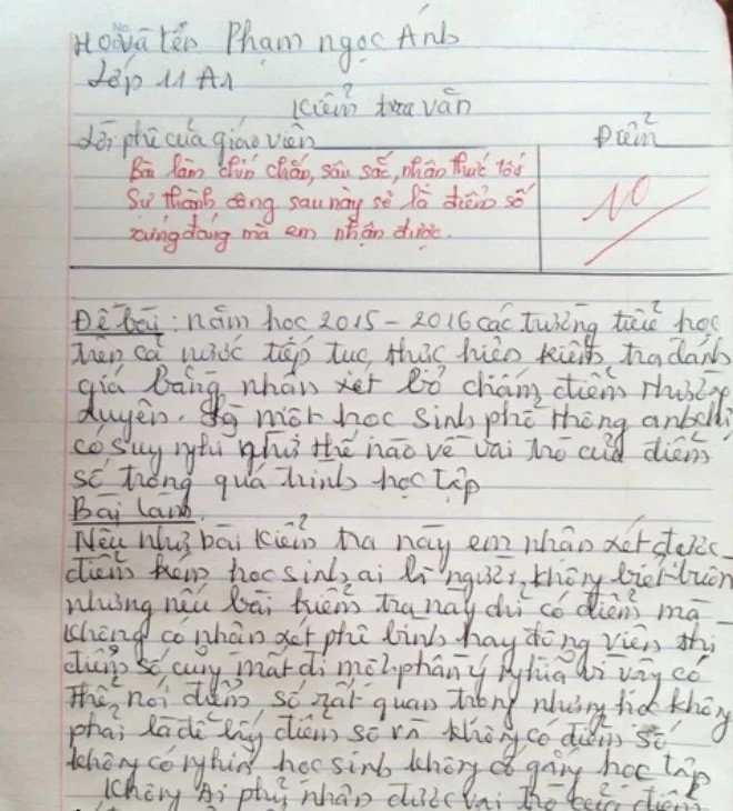 Trước đó, vào năm 2016, nữ sinh Phạm Ngọc Ánh – khi đó là học sinh lớp 11 Trường THPT Lương Thế Vinh (Nam Định) đã gây ấn tượng mạnh với giáo viên qua một bài văn nghị luận bàn về vai trò của điểm số trong học tập.