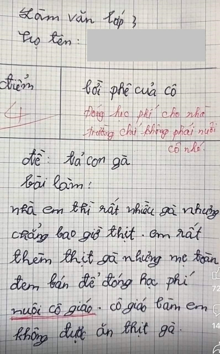 Theo đó, em học sinh đã trình bày nội dung bài văn của mình như sau: "Nhà em thì rất nhiều gà nhưng chẳng bao giờ thịt. Em rất thèm thịt gà nhưng mẹ toàn đem bán để đóng học phí nuôi cô giáo. Cô giáo làm em không được ăn thịt gà".