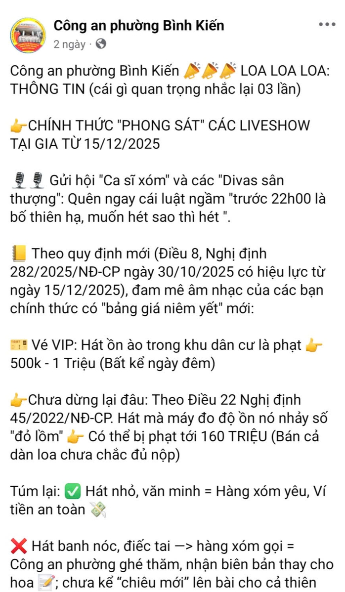 Theo Công an phường Bình Kiến, Điều 8 Nghị định 282/2025/NĐ-CP (có hiệu lực từ ngày 15-12) quy định hành vi hát karaoke gây ồn ào trong khu dân cư có thể bị xử phạt từ 500.000 đồng đến 1 triệu đồng, không phân biệt ngày hay đêm.