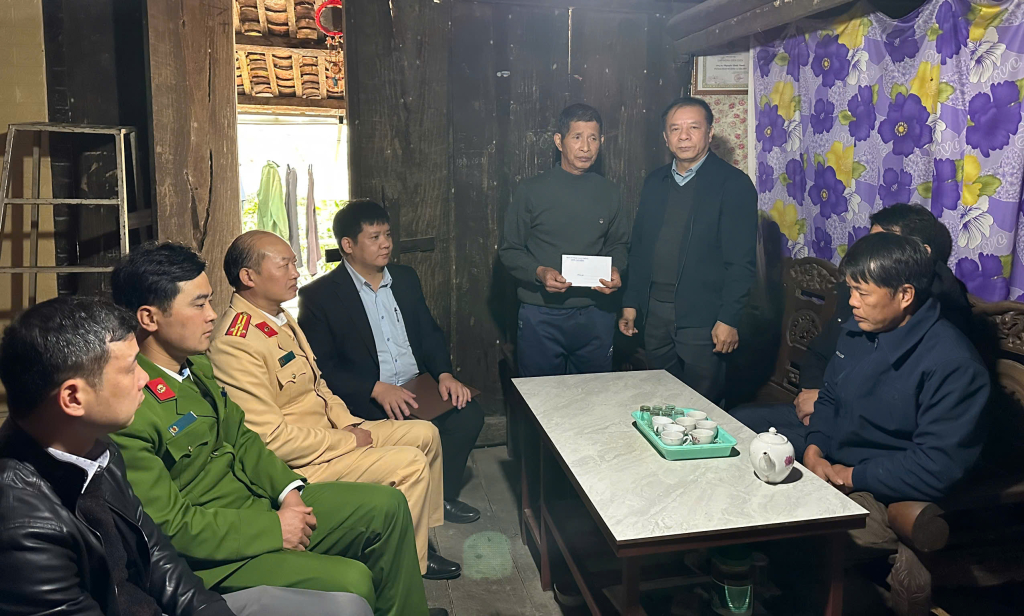 Đại diện Ban An toàn giao thông tỉnh tặng quà, động viên gia đình ông Nguyễn Đình Chinh, xóm Nà Cườm, xã Độc Lập có con bị tử vong do tai nạn giao thông.