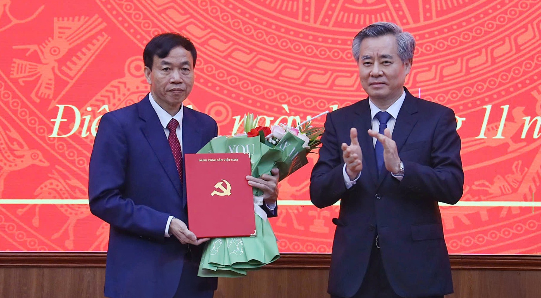 Phó trưởng Ban Tổ chức Trung ương Nguyễn Quang Dương trao Quyết định của Ban Bí thư cho Phó Bí thư Tỉnh ủy Điện Biên Lê Văn Lương.