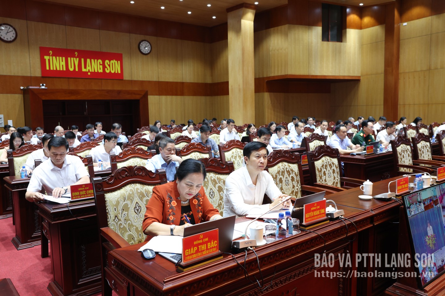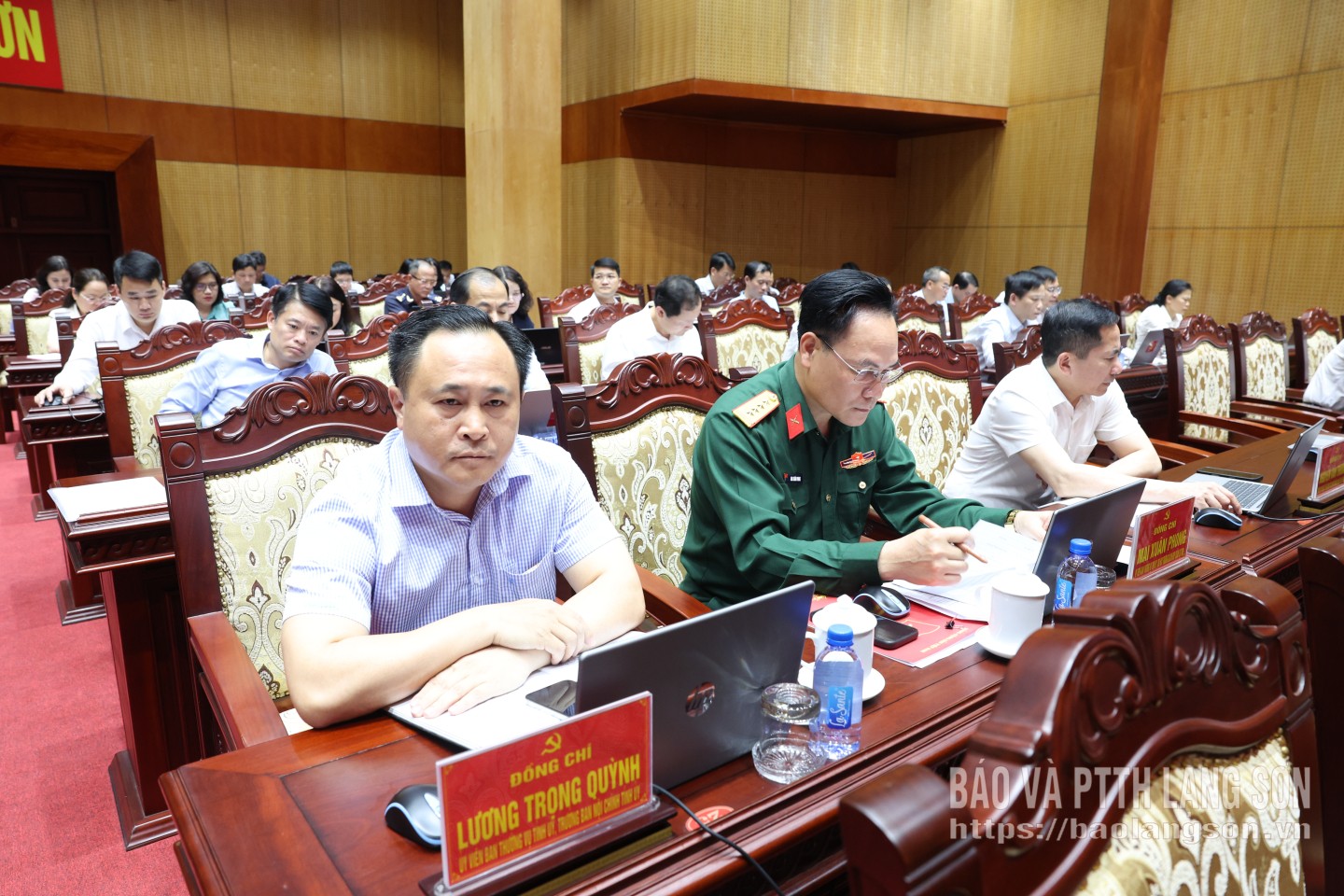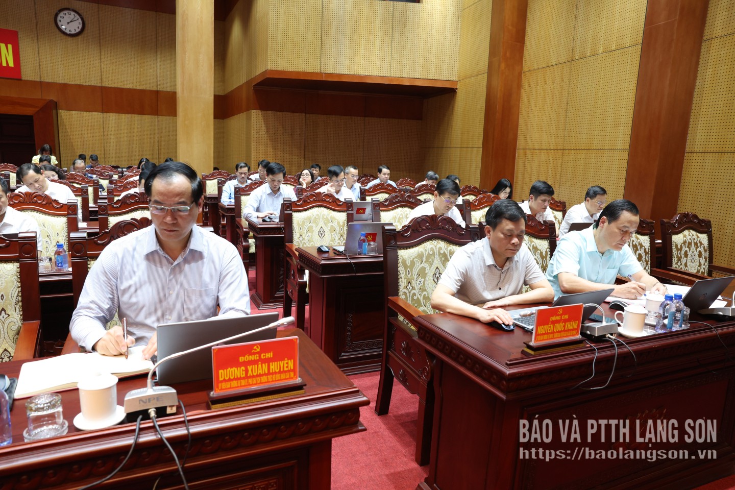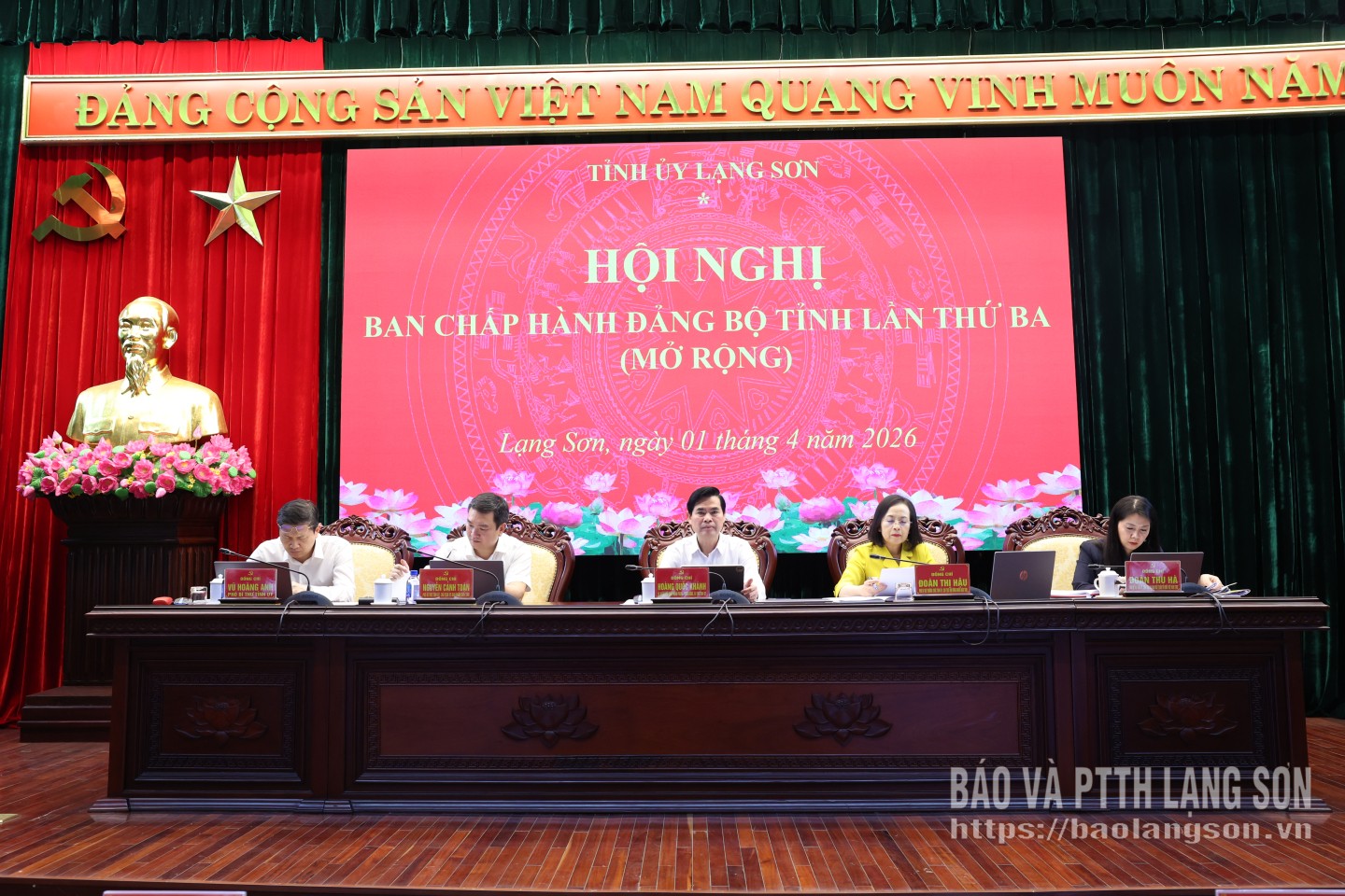 Các đồng chí: Hoàng Quốc Khánh, Ủy viên Trung ương Đảng, Bí thư Tỉnh ủy; Đoàn Thị Hậu, Phó Bí thư Thường trực Tỉnh ủy, Chủ tịch HĐND tỉnh; Nguyễn Cảnh Toàn, Phó Bí thư Tỉnh ủy, Chủ tịch UBND tỉnh; Đoàn Thu Hà, Phó Bí thư Tỉnh ủy, Chủ tịch Ủy ban MTTQ Việt Nam tỉnh; Vũ Hoàng Anh, Phó Bí thư Tỉnh ủy đồng chủ trì hội nghị.