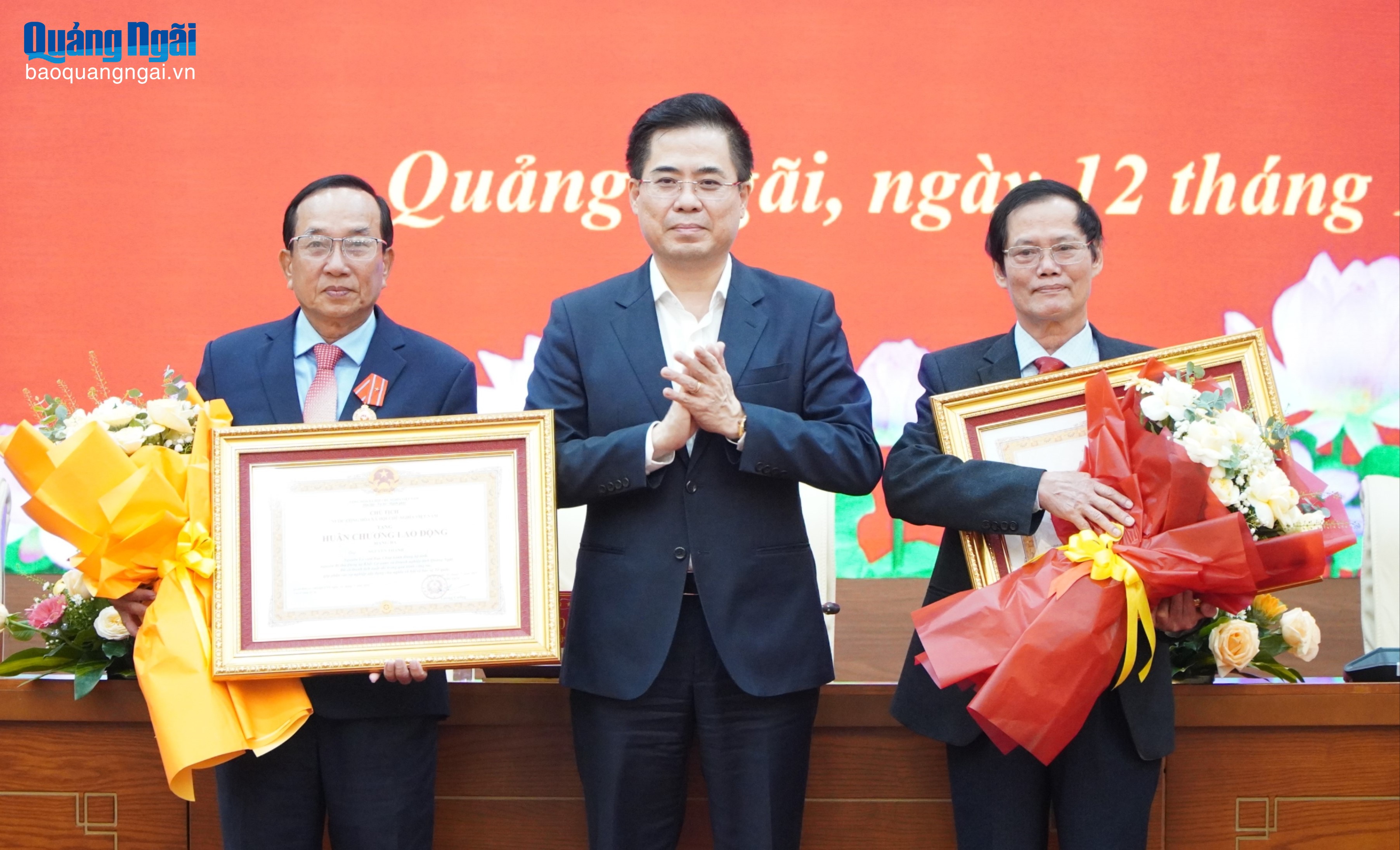 Phó Bí thư Tỉnh ủy, Bí thư Đảng ủy, Chủ tịch UBND tỉnh Nguyễn Hoàng Giang trao tặng Huân chương Lao động hạng Ba cho 2 cá nhân.