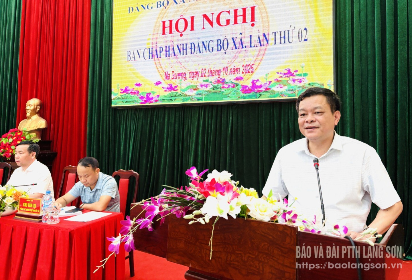 Đồng chí đề nghị: thời gian tới, Ban Chấp hành Đảng bộ xã Na Dương cần khẩn trương tổ chức nghiên cứu, học tập, quán triệt đầy đủ, cụ thể hóa sâu sắc 34 chỉ tiêu, 6 nhiệm vụ trọng tâm, 3 khâu đột phá, 7 nhiệm vụ, giải pháp chủ yếu của Nghị quyết Đại hội đại biểu Đảng bộ tỉnh lần thứ XVIII, nhiệm kỳ 2025 - 2030 đề ra; tiếp tục tập trung, khai thác tối đa tiềm năng, lợi thế của địa phương để phát triển kinh tế, văn hóa - xã hội; phát triển kinh tế tư nhân, đẩy mạnh chuyển đổi số trong các lĩnh vực; đẩy mạnh xây dựng Đảng về chính trị, tư tưởng, đạo đức; lãnh đạo, chỉ đạo thực hiện tốt công tác bầu cử Đại biểu Quốc hội và HĐND các cấp, nhiệm kỳ 2026 - 2031; phấn đấu hoàn thành và hoàn thành vượt mức chỉ tiêu, mục tiêu, nhiệm vụ đề ra trong năm 2025.