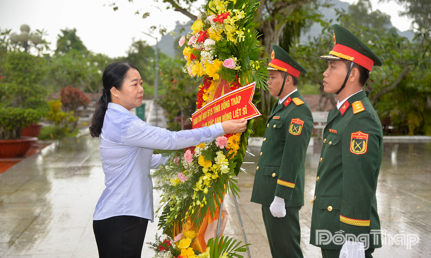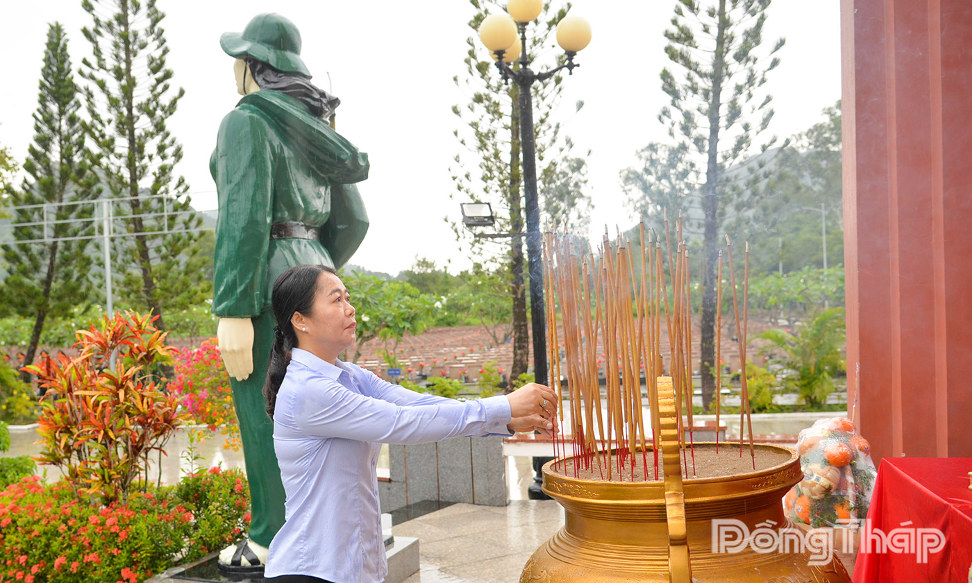 Đồng chí Nguyễn Thị Kiều Loan, Phó Giám đốc Sở Nội vụ tỉnh Đồng Tháp, Phó Trưởng Ban Chỉ đạo 515 tỉnh Đồng Tháp thực hiện nghi thức trình hoa và dâng hương Đài tưởng niệm các Anh hùng liệt sĩ Nghĩa trang Liệt sĩ Dốc Bà Đắc.