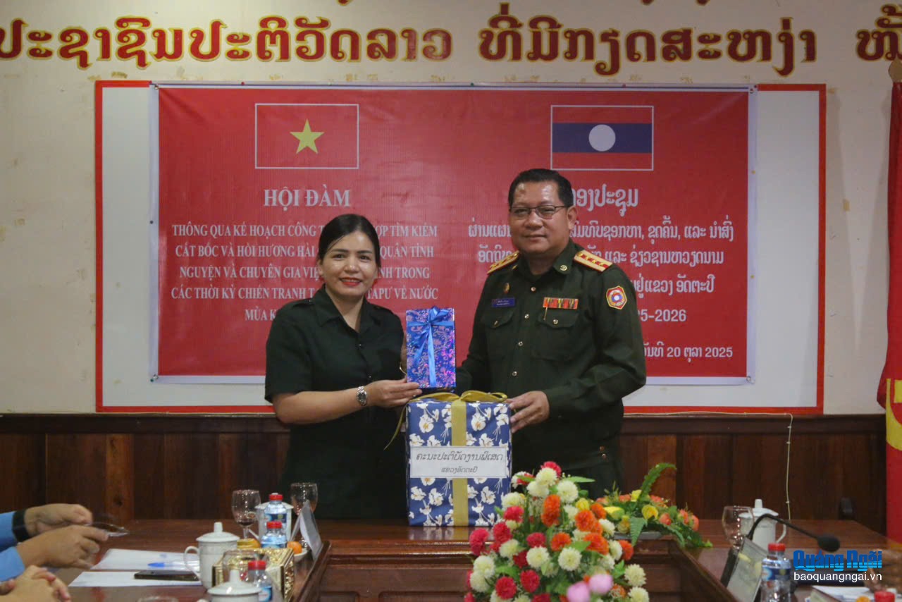 Sáng 20/10, tại tỉnh Attapeu, Ủy viên Ban Thường vụ Tỉnh ủy, Phó Chủ tịch Thường trực UBND tỉnh, Trưởng ban Chỉ đạo 515 tỉnh Quảng Ngãi Y Ngọc và các thành viên đã có buổi Hội đàm với Ban Công tác đặc biệt tỉnh Attapeu về việc tiếp tục tìm kiếm, quy tập, hồi hương hài cốt liệt sĩ quân tình nguyện và chuyên gia Việt Nam hy sinh tại tỉnh Attapeu, mùa khô 2025 - 2026.