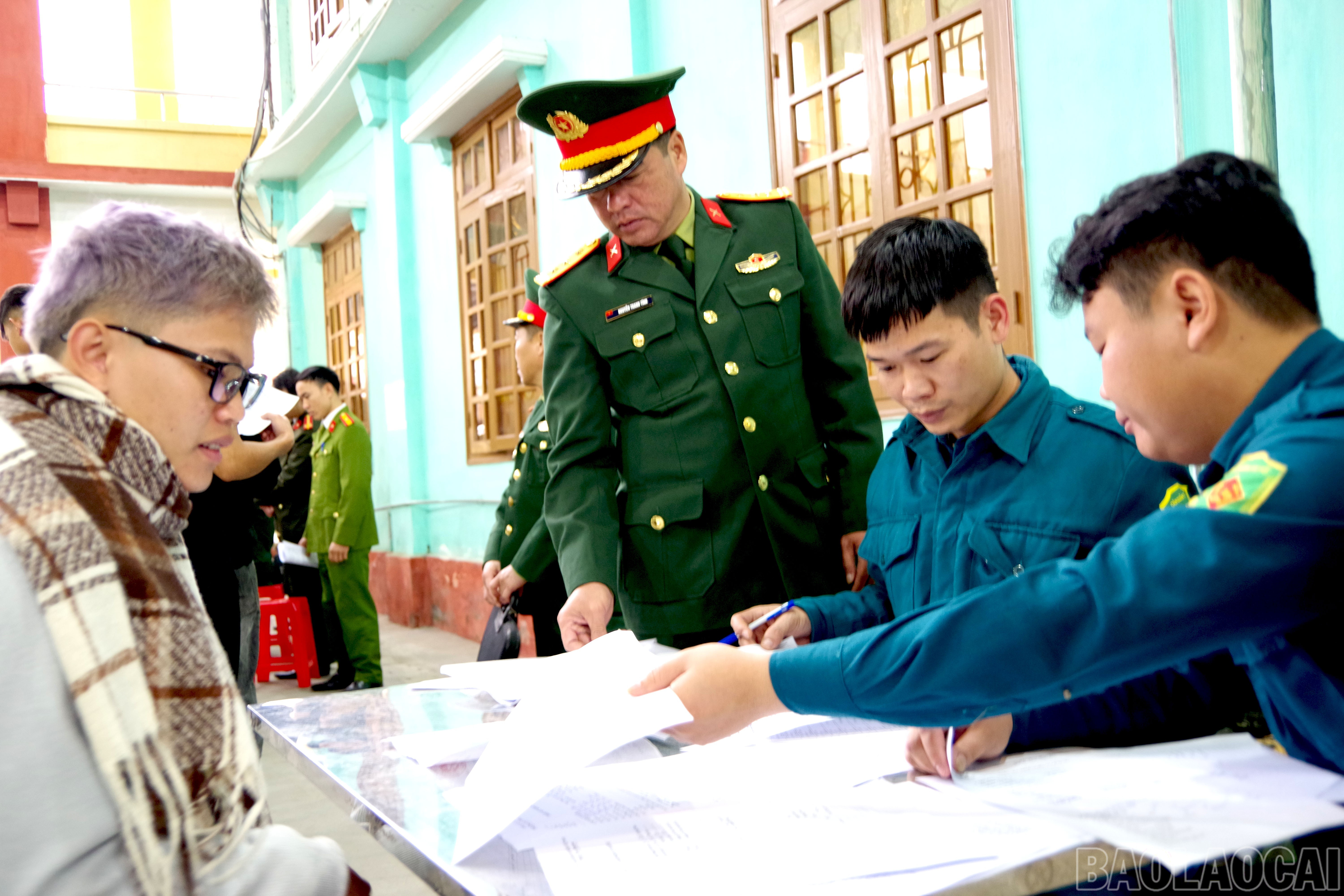 Thượng tá Nguyễn Thanh Tĩnh - Chỉ huy trưởng Ban Chỉ huy Phòng thủ khu vực 4 - Nghĩa Lộ kiểm tra danh sách công dân khám nghĩa vụ quân sự.