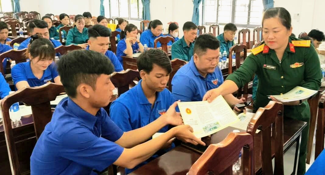 Ban Chỉ huy Phòng thủ khu vực 6 - Ngọc Chúc phát tờ rơi tuyên truyền pháp luật cho đoàn viên, thanh niên. Ảnh: Minh Thắng
