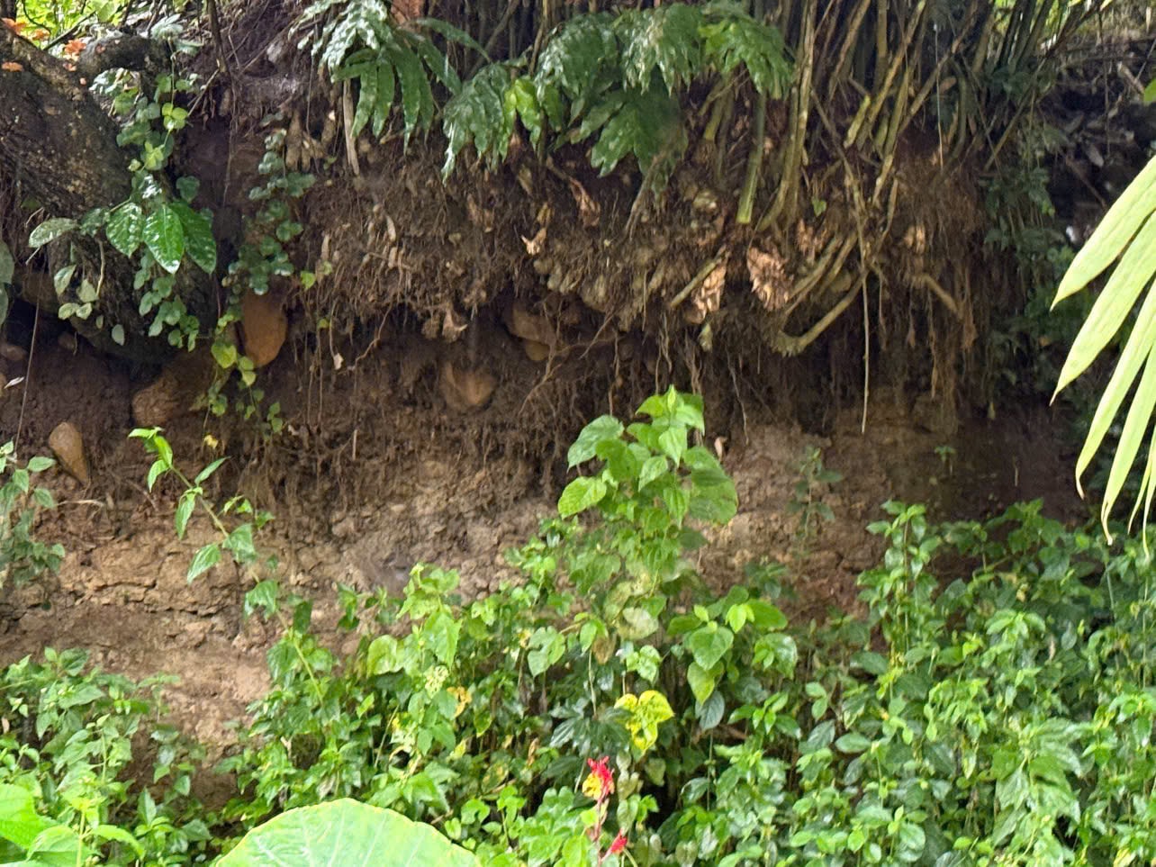 Phần đất ở khu vực dưới taluy đã xuất hiện dấu hiệu sạt trượt, tiềm ẩn nguy cơ ảnh hưởng đến các hộ dân sinh sống phía dưới
