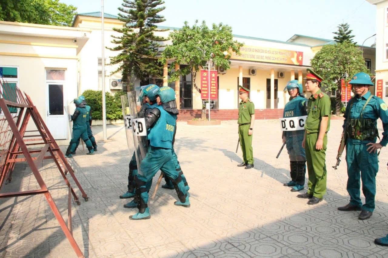 Các lực lượng tham gia diễn tập phương án sẵn sàng chiến đấu bảo vệ cơ quan, đơn vị xã Hòa Lạc. Ảnh: PV