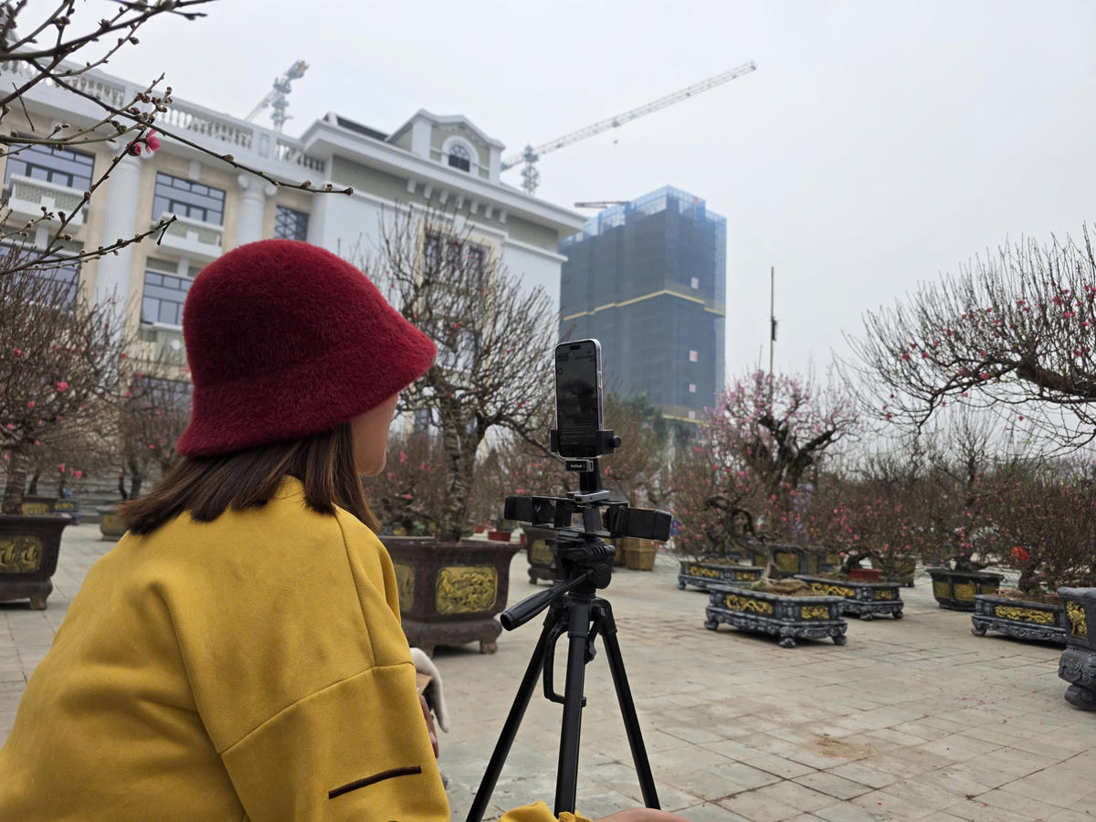 Tại chợ hoa Tết Thanh niên Phú Thọ, không chỉ anh Mạnh, nhiều tiểu thương khác tại đây cũng nhanh chóng bắt nhịp xu hướng bán hàng qua mạng xã hội. Một nữ tiểu thương bán đào bích Nhật Tân cánh kép liên tục livestream, trả lời bình luận khách hỏi giá. Theo giới thiệu, những gốc đào lớn, tán rộng khoảng 3m, cao gần 2,8m có giá từ 26–28 triệu đồng, đã bao gồm chi phí vận chuyển đến một số tỉnh, thành lân cận.
