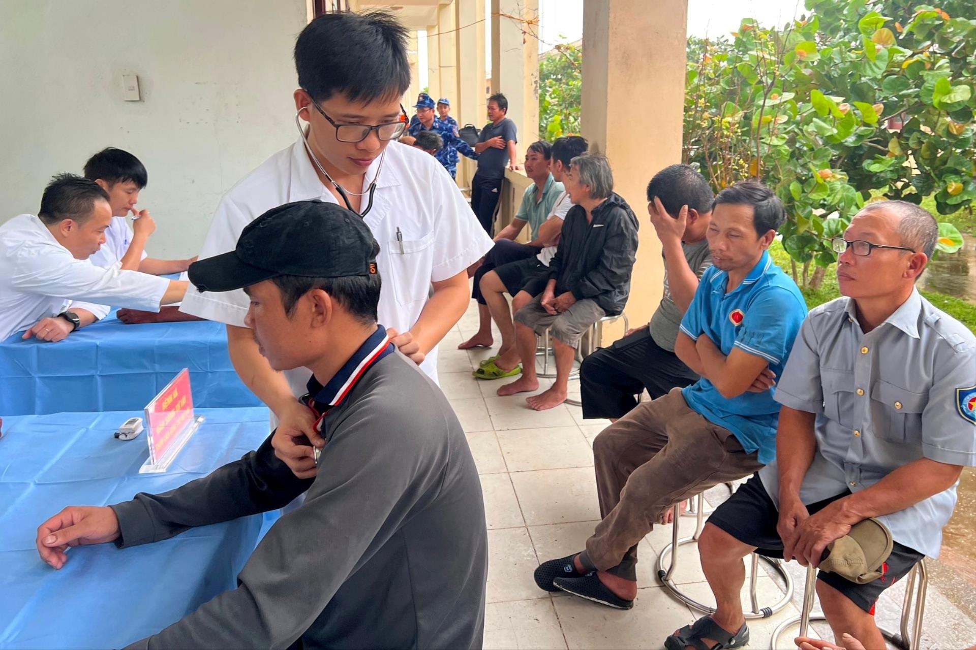 Lực lượng quân dân y trên đảo Song Tử Tây tổ chức thăm khám, kiểm tra sức khỏe cho các thuyền viên tàu cá Đà Nẵng sau khi được đưa lên đảo an toàn.