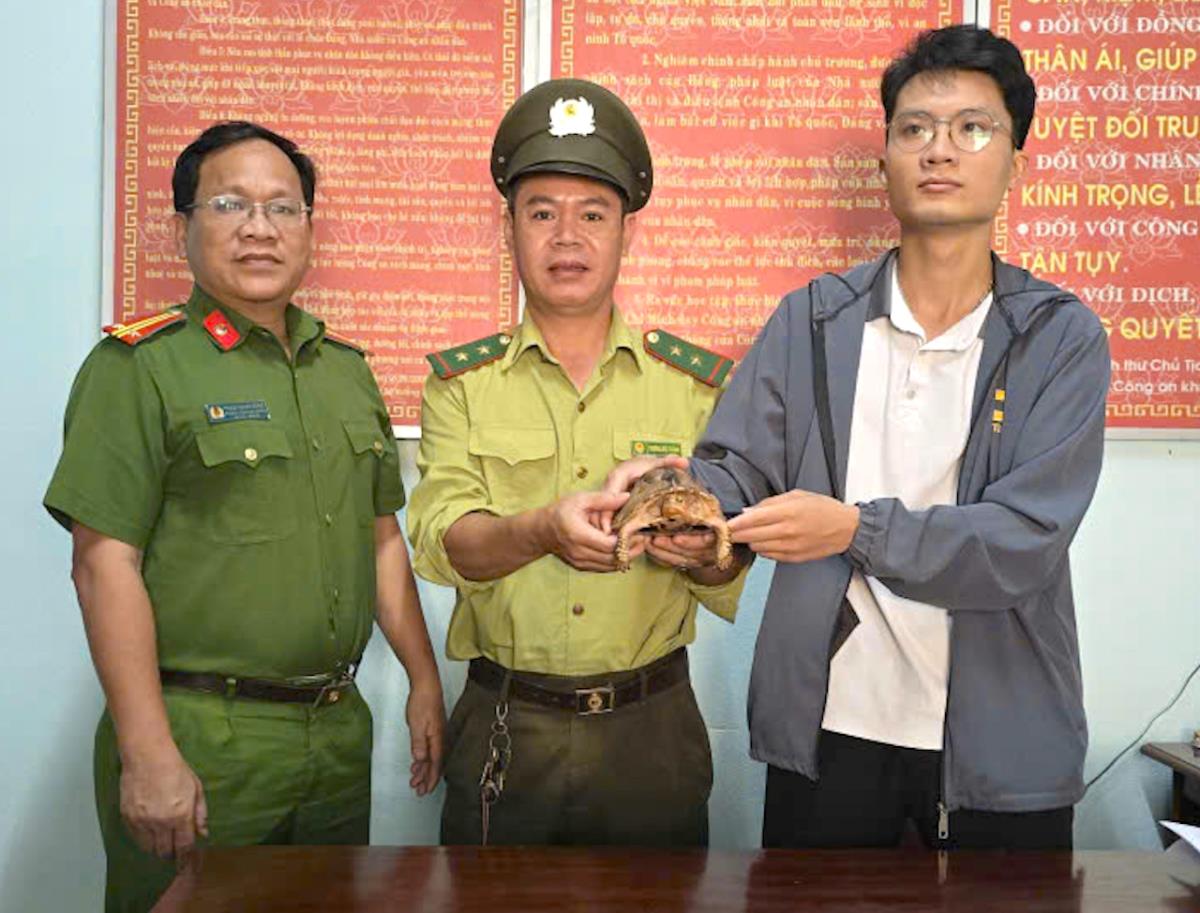 Cá thể rùa này nặng gần 1kg, do anh Trần Công Trưởng (tạm trú tại phường Điện Bàn Đông) phát hiện, bắt được gần phòng trọ và tự giác liên hệ cơ quan Công an để giao nộp. Đây là loại rùa hộp trán vàng miền Trung, đặc hữu của miền Trung Việt Nam thuộc diện động vật hoang dã được ưu tiên bảo vệ, cực kỳ nguy cấp trong Sách Đỏ Việt Nam và thế giới.