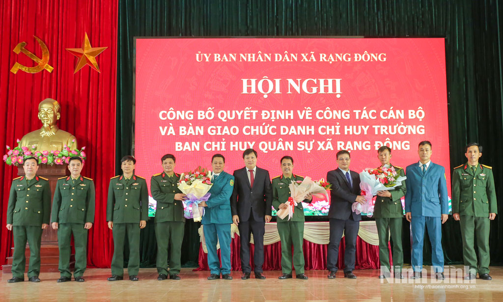 Hội nghị cũng Công bố Quyết định số 12/QĐ-QK3 ngày 11/1/2026 của Chính ủy Quân khu 3. Trong đó, bổ nhiệm đồng chí Trung tá Bùi Đức Cường, nguyên Phó Trung đoàn trưởng Trung đoàn 180 (Bộ CHQS tỉnh Ninh Bình) giữ chức vụ Chỉ huy trưởng Ban CHQS phường Mỹ Lộc; bổ nhiệm đồng chí Trung tá Đoàn Tiến Vĩnh, nguyên Phó Trung đoàn trưởng kiêm Tham mưu trưởng Trung đoàn 180 (Bộ CHQS tỉnh Ninh Bình) giữ chức vụ Chỉ huy trưởng Ban CHQS xã; bổ nhiệm Trung tá Bùi Quốc Vương, giữ chức Chính trị viên phó Ban CHQS xã Rạng Đông; bổ nhiệm Đại úy Hoàng Văn Đức, Phó đại đội trưởng Đại đội 1, Tiểu đoàn 1, Trung đoàn 180 (Bộ CHQS tỉnh) giữ chức Phó Chỉ huy trưởng Ban CHQS xã Rạng Đông.