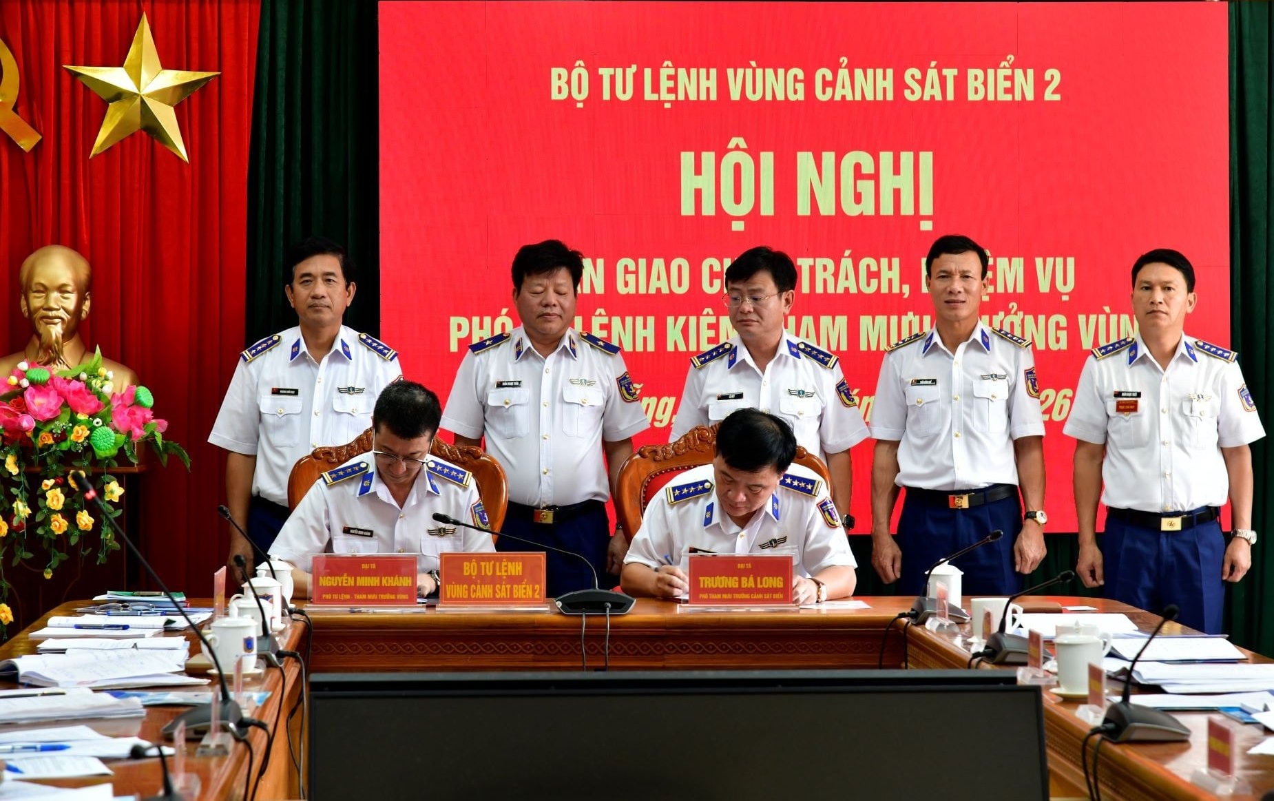 Đại tá Trương Bá Long và Đại tá Nguyễn Minh Khánh ký biên bản bàn giao chức trách, nhiệm vụ Phó Tư lệnh kiêm Tham mưu trưởng Vùng Cảnh sát biển 2. Ảnh: N.TRUNG