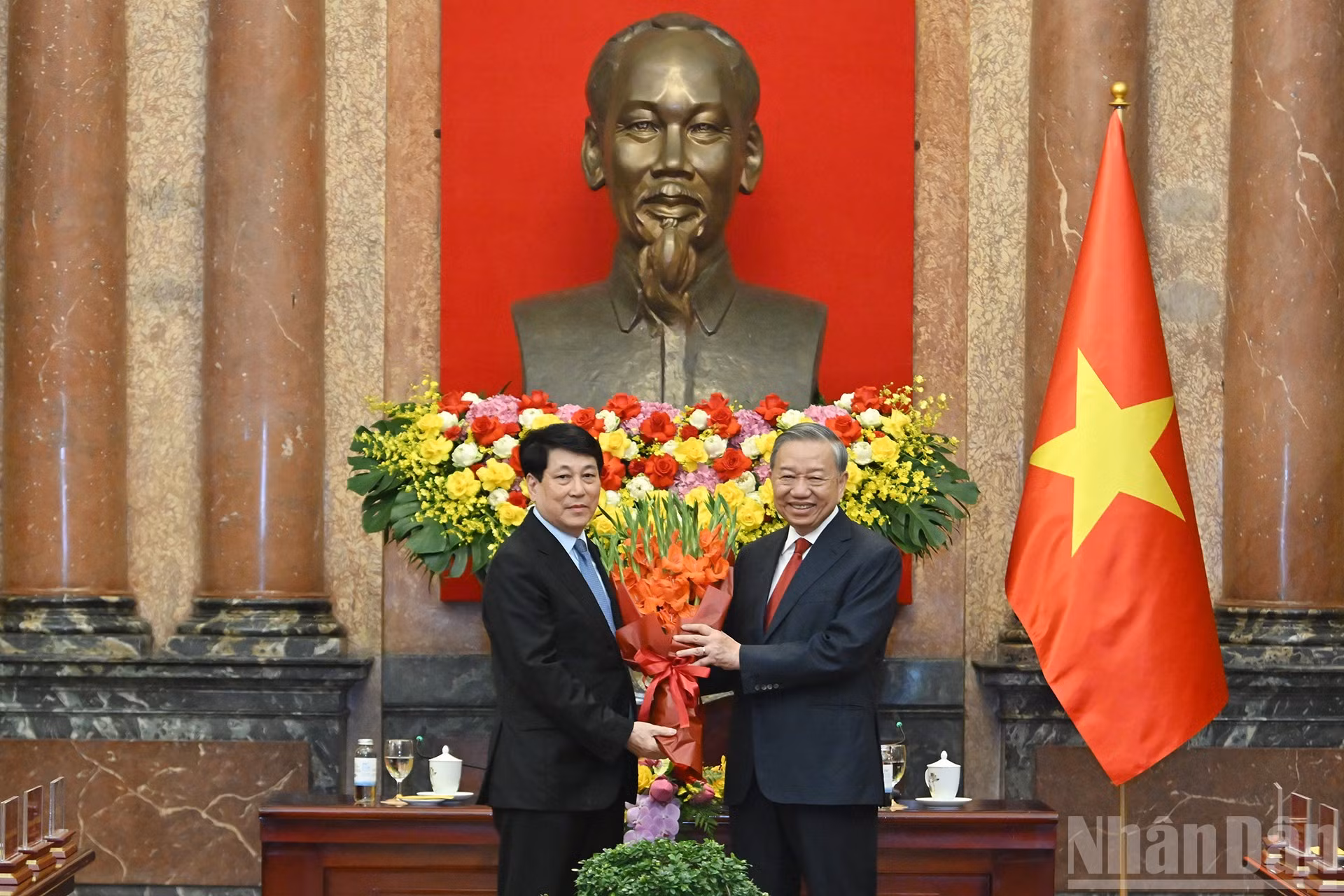 Tổng Bí thư, Chủ tịch nước Tô Lâm tặng hoa nguyên Chủ tịch nước Lương Cường.