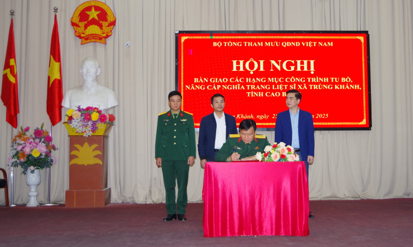 Thực hiện Quyết định của Thủ trưởng Bộ Tổng tham mưu giao Cục Chính trị - Bộ Tổng Tham mưu làm chủ đầu tư các hạng mục công trình tu bổ, nâng cấp Nghĩa trang liệt sĩ xã Trùng Khánh với quy mô công trình với diện tích 1.778 m2 gồm: xây dựng 1 nhà chờ 1 tầng, 2 gian; xây mới sân nhà chờ diện tích 102 m2; cải tạo hệ thống hạ tầng kỹ thuật đồng bộ gồm sân, đường, tường rào, hệ thống cấp điện, hệ thống cấp, thoát nước… Thời gian khởi công ngày 8/9/2025 hoàn thành vào ngày 8/11/2025, tổng kinh phí đầu tư 1,5 tỷ đồng.