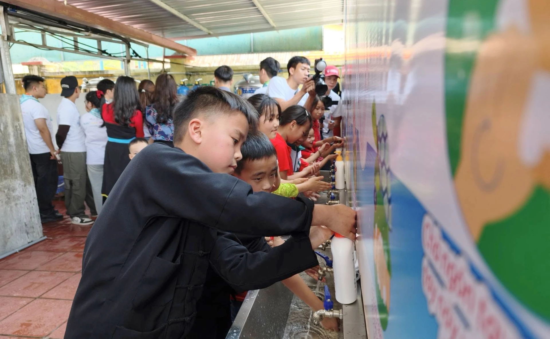 Học sinh trường Phổ thông Dân tộc bán trú Tiểu học Quản Bạ phấn khởi sử dụng nước sạch.