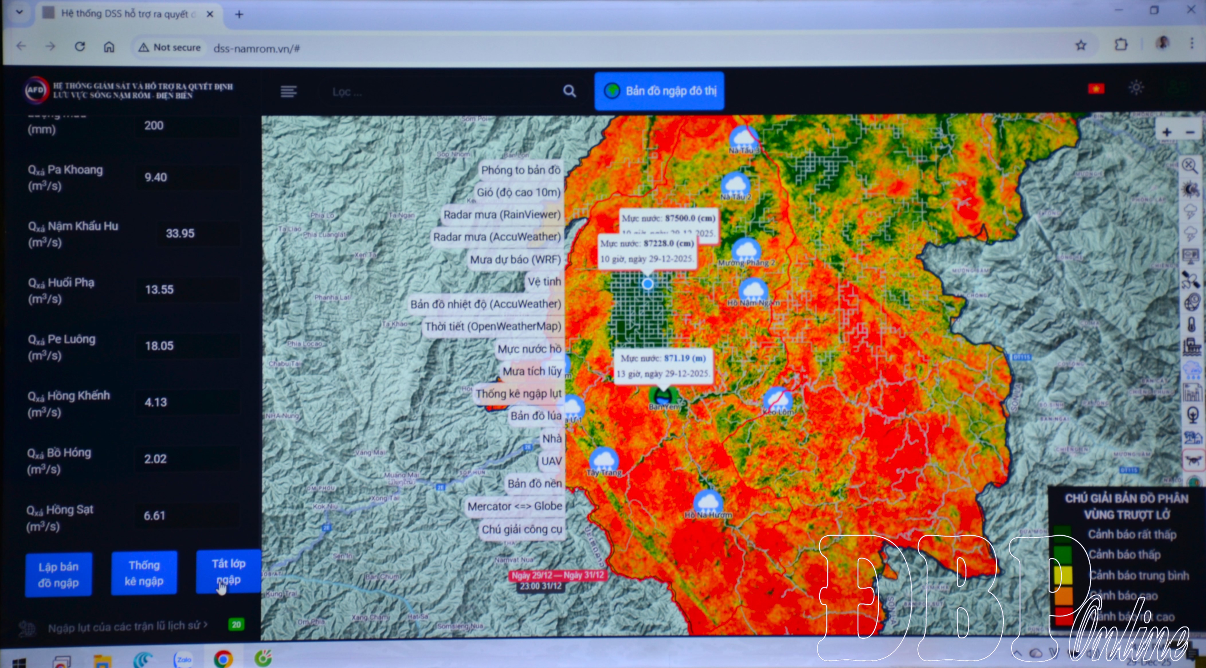 Giao diện hệ thống hỗ trợ ra quyết định về rủi ro và ngập lụt trên lưu vực sông Nậm Rốm.