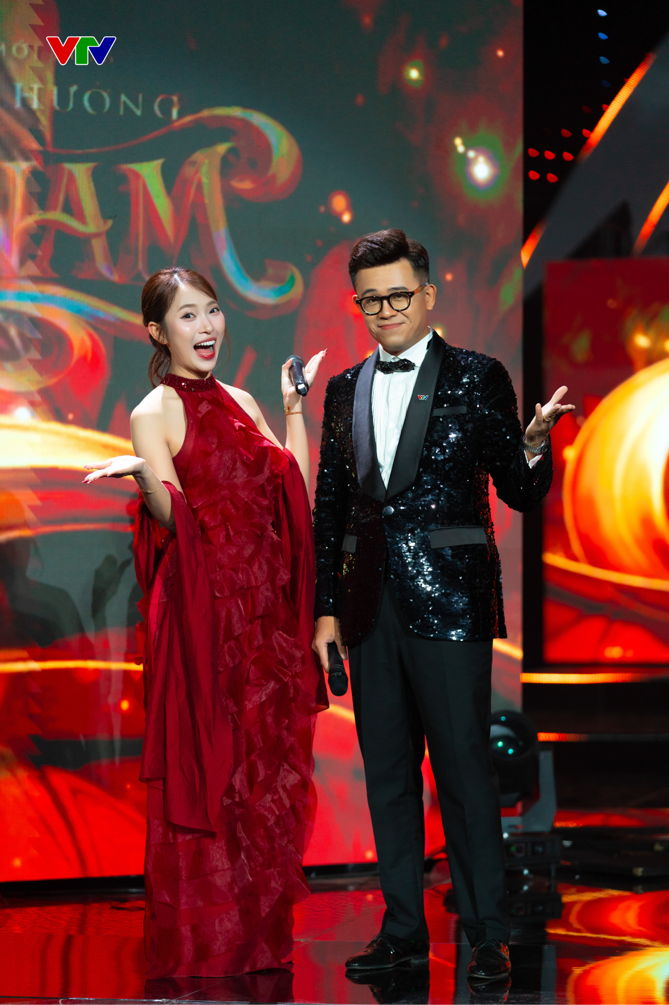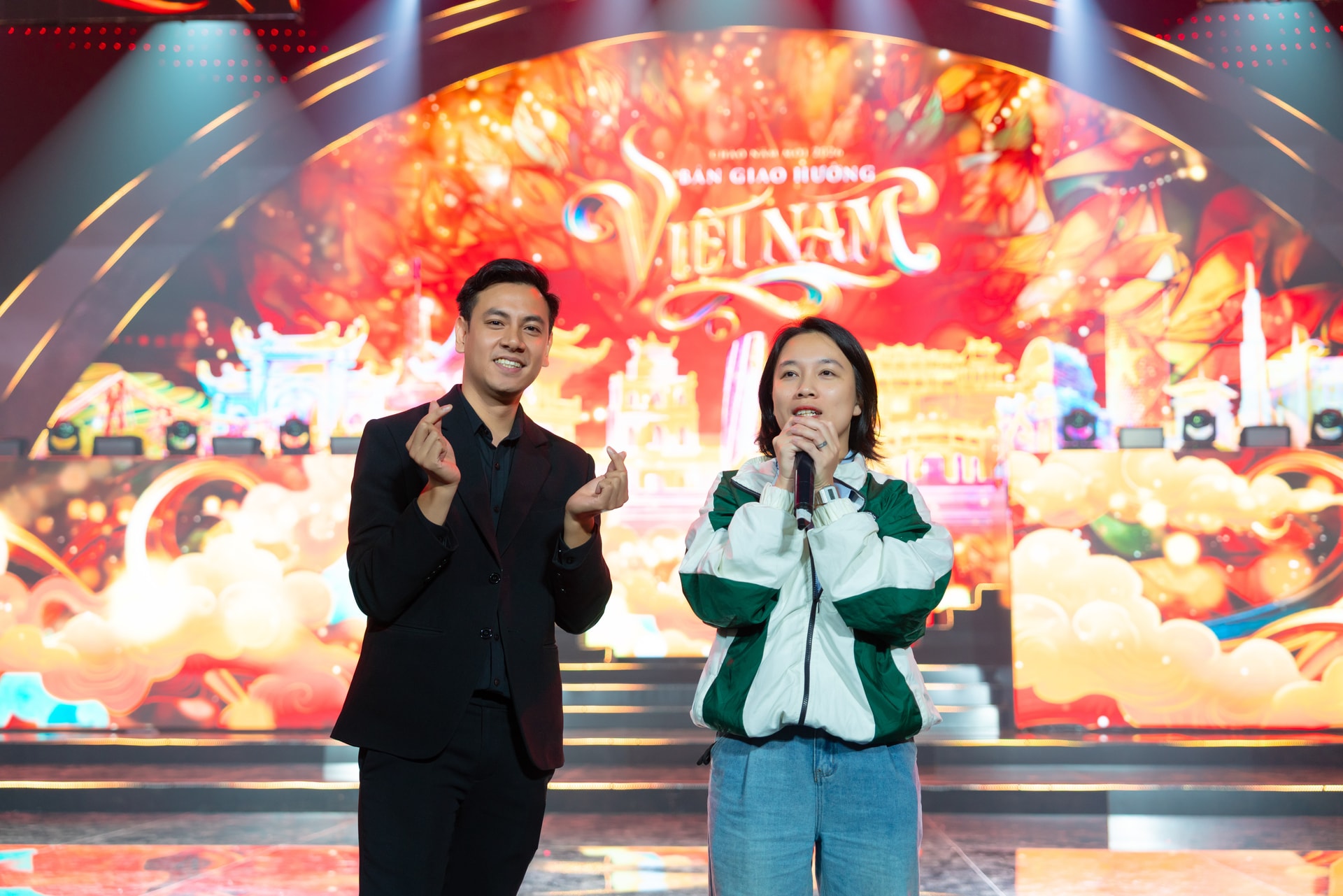 Nhà báo Nguyễn Quỳnh Trang (phải) chỉ đạo tại sân khấu chương trình