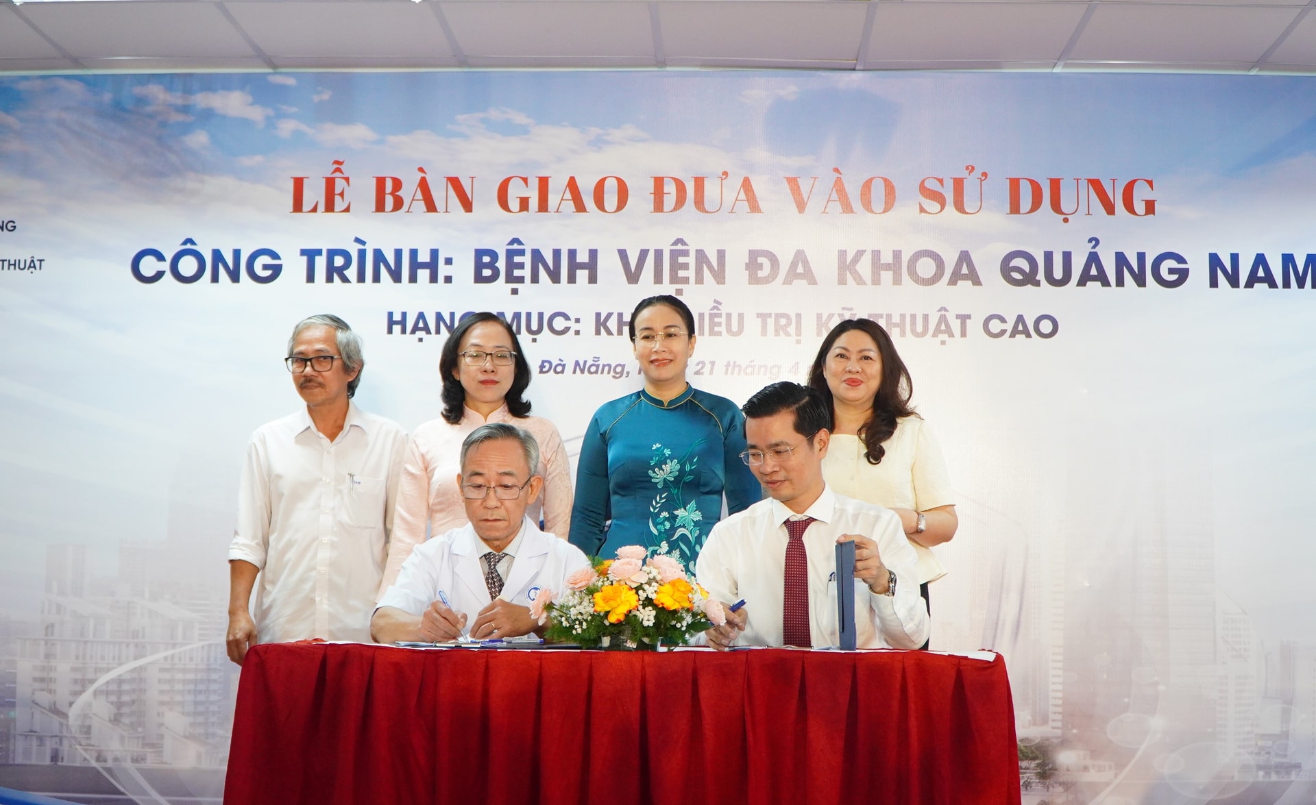 Lãnh đạo Ban Quản lý dự án đầu tư xây dựng các công trình dân dụng, công nghiệp và hạ tầng kỹ thuật thành phố và Bệnh viện Đa khoa Quảng Nam ký kết bàn giao công trình Khu điều trị kỹ thuật cao. Ảnh: VINH ANH