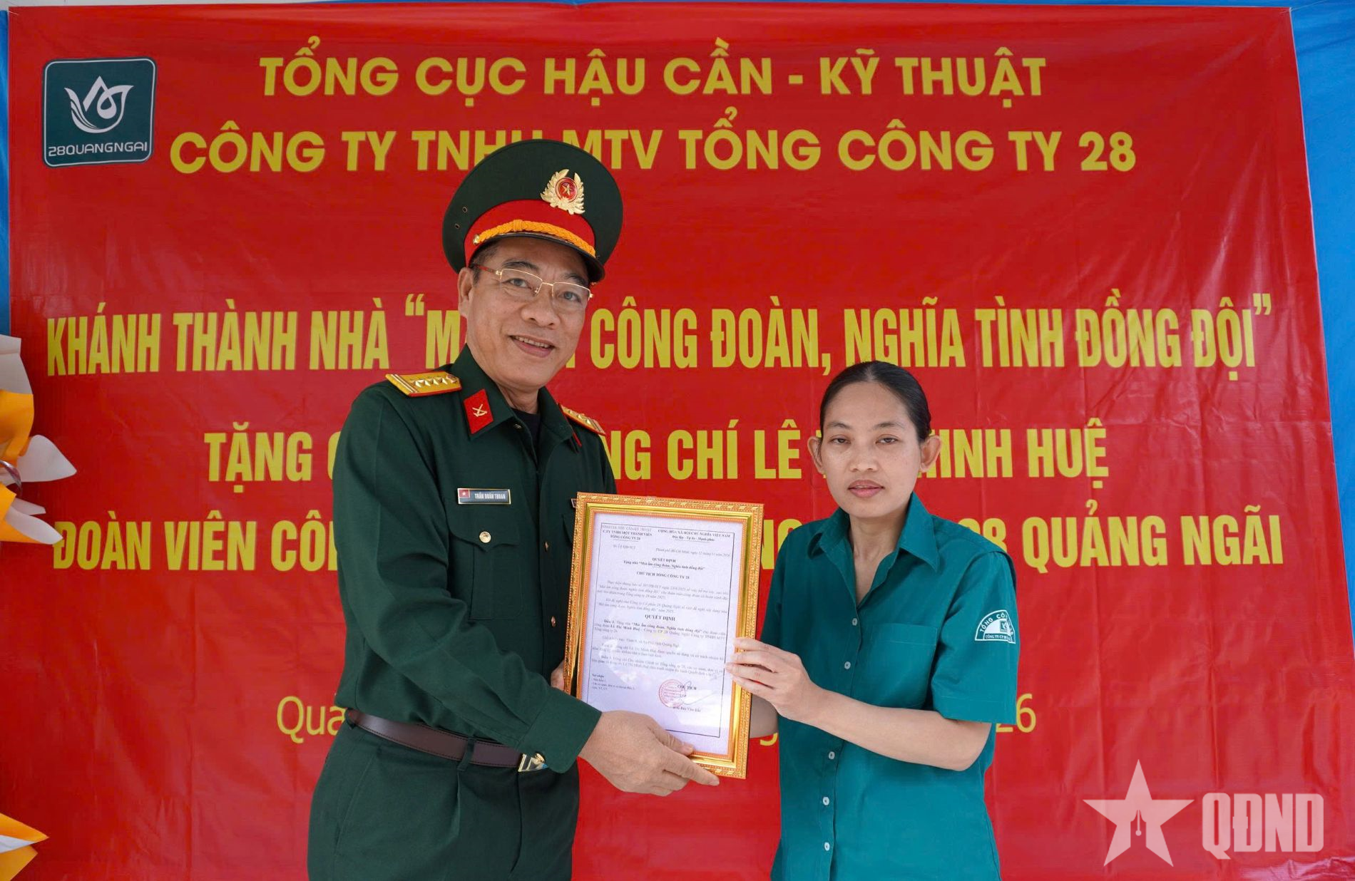 Đảng ủy, chỉ huy Công ty Cổ phần 28 Quảng Ngãi đã xét và đề nghị Tổng công ty 28 hỗ trợ xây dựng nhà “Mái ấm công đoàn, nghĩa tình đồng đội” cho gia đình chị Huệ.