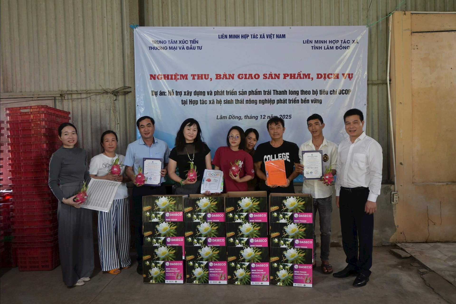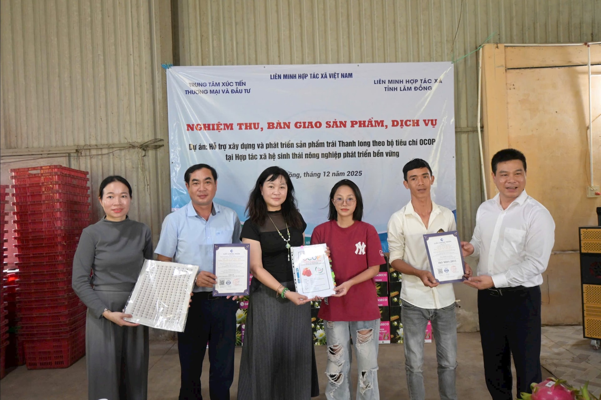 Tại buổi làm việc, các bên liên quan đã nghiệm thu, bàn giao các nội dung như: Tư vấn phát triển sản phẩm, xây dựng hồ sơ sản phẩm, câu chuyện sản phẩm; xây dựng bộ nhận diện thương hiệu sản phẩm HTX; thiết lập mã truy xuất nguồn gốc sản phẩm cho HTX; trao Giấy chứng nhận HACCP; Giấy chứng nhận ISO 9001, 5.600 thùng giấy đựng thanh long…
