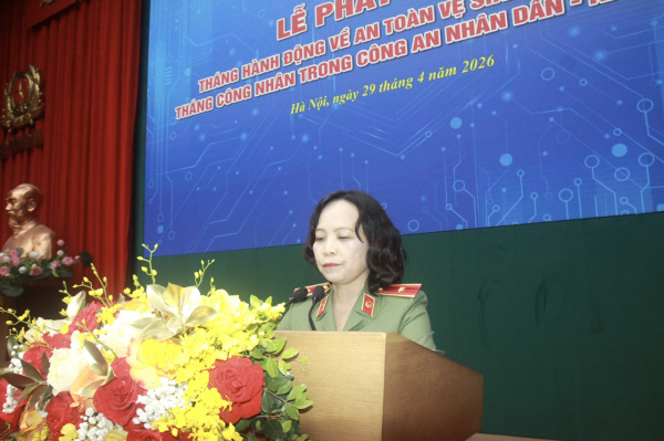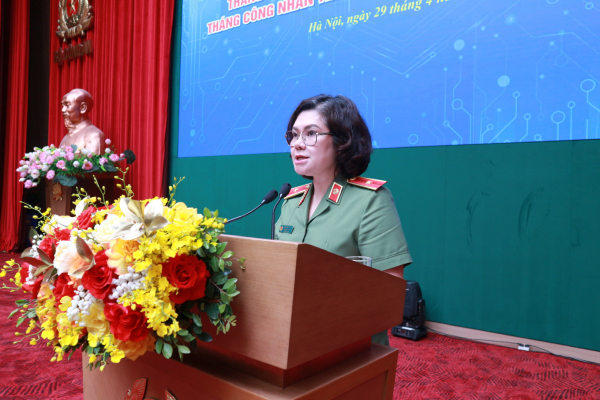Thay mặt lãnh đạo Cục Công nghiệp an ninh, Thượng tá Nguyễn Thị Xuân Huệ, Phó Cục trưởng phát biểu hưởng ứng lễ phát động.