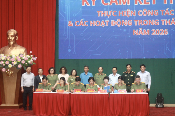 Thứ trưởng Đặng Hồng Đức, đồng chí Huỳnh Thanh Xuân và các đại biểu chứng kiến đại diện Công an các đơn vị ký cam kết thi đua thực hiện công tác ATVSLĐ và các hoạt động trong Tháng Công nhân năm 2026.