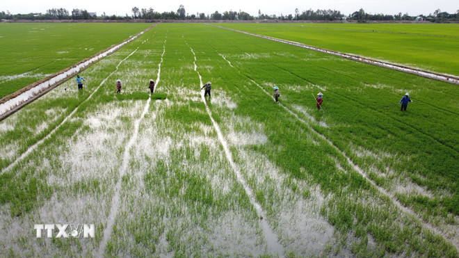 Nông dân xã Xuân Giang (Ninh Bình) phun thuốc trừ sâu cho lúa. (Ảnh: Thái Thuần/TTXVN)