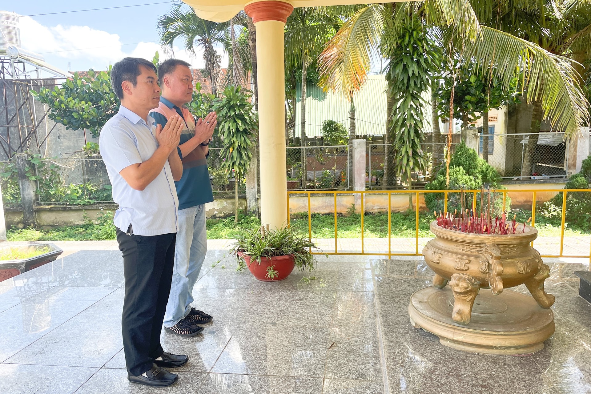 Ngôi nhà hai tầng của gia đình anh Cường sát cạnh Nhà bia. Mỗi ngày, anh Cường đều tự nguyện vào thắp hương, quét dọn, tỉa cây, cúng thuốc lá, cà phê, dù không có chế độ nào và anh cũng không đòi hỏi công lao.
