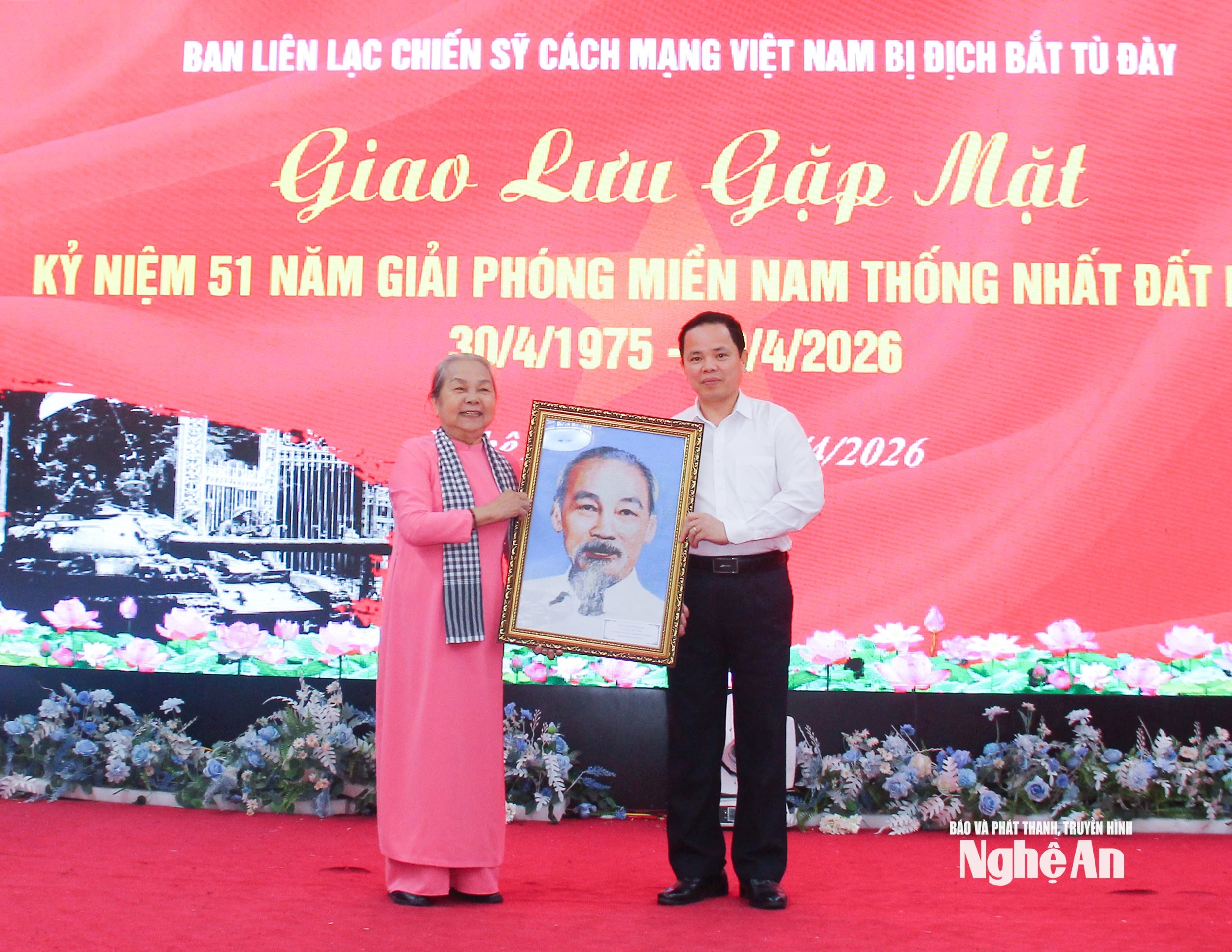 Trưởng Ban liên lạc toàn quốc Chiến sĩ cách mạng bị địch bắt tù đày Việt Nam - Hoàng Thị Khánh trao tặng tỉnh Nghệ An bức ảnh chân dung Chủ tịch Hồ Chí Minh được mô phỏng từ bức tranh do nữ chiến sĩ cách mạng bị địch bắt tù đày thêu. Ảnh: Mai Hoa