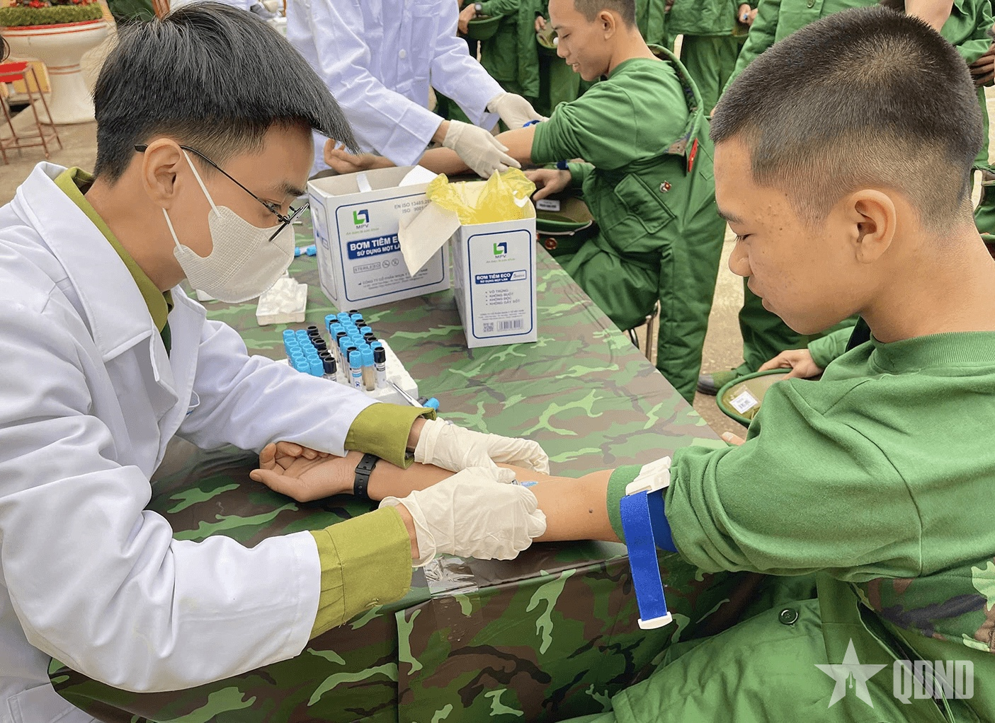Thượng úy, Bác sĩ Trần Trương Công Cường (áo trắng) thăm khám lấy máu xét nghiệm cho chiến sĩ.