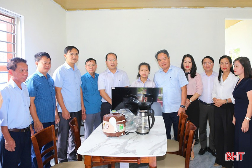 Trưởng ban Nội chính Tỉnh ủy Nguyễn Đình Hải và đại biểu trao nhà và tặng các thiết bị gia dụng cho gia đình em Hiền.